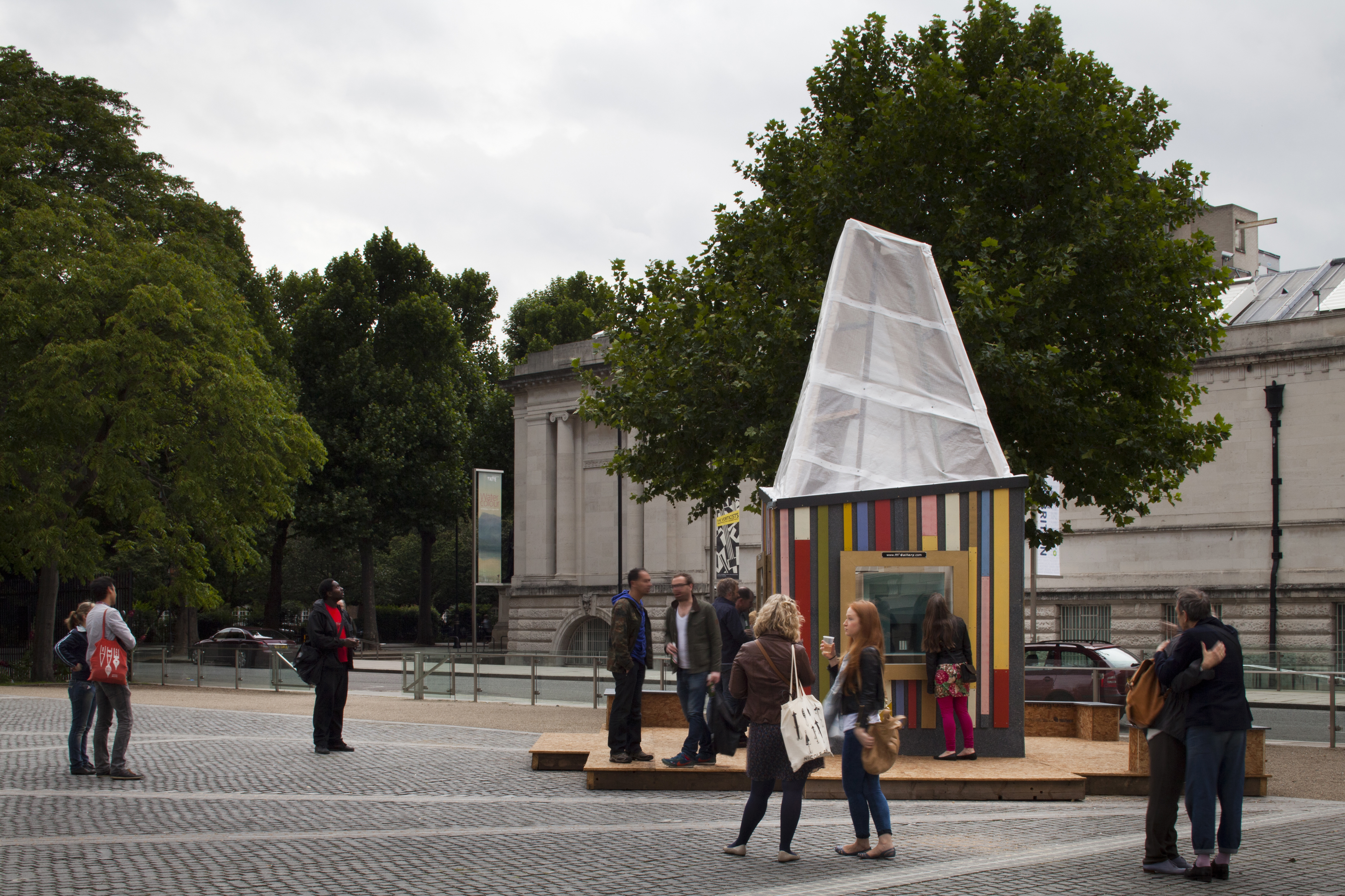A pop up gallery for the summer on the Rootstein Hopkins Parade Ground at Chelsea College of Art and Design opposite the entry to Tate Britain