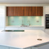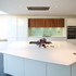 The kitchen island takes a dynamic, triangular form in response to the garden design.