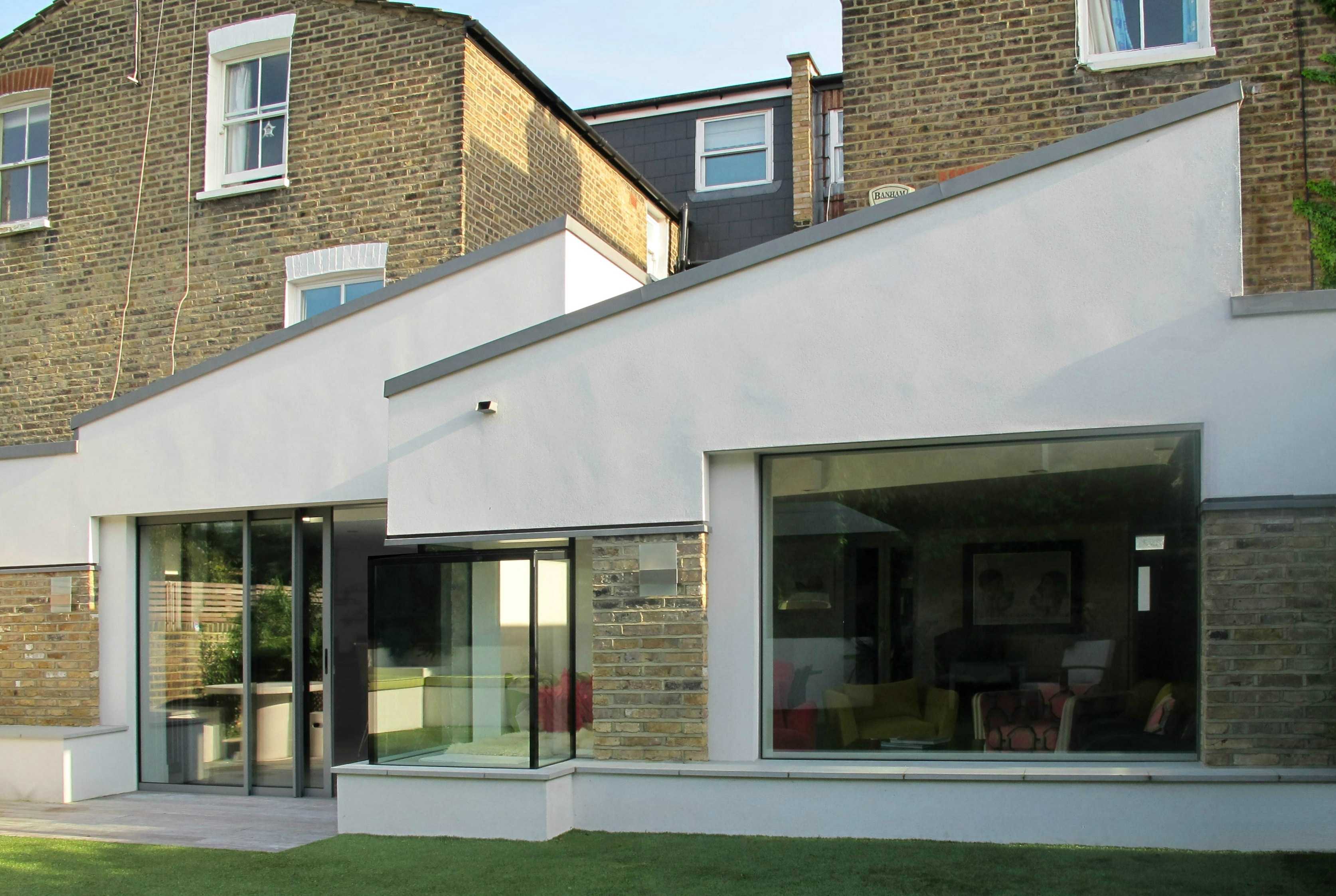 Outside, the form of the roofs allows south light into the main space but also reflects the previous existence of the building as two houses. The brick and render of the existing houses are used for the extension but the brick is detailed to indicate that the new walls are cavity construction.