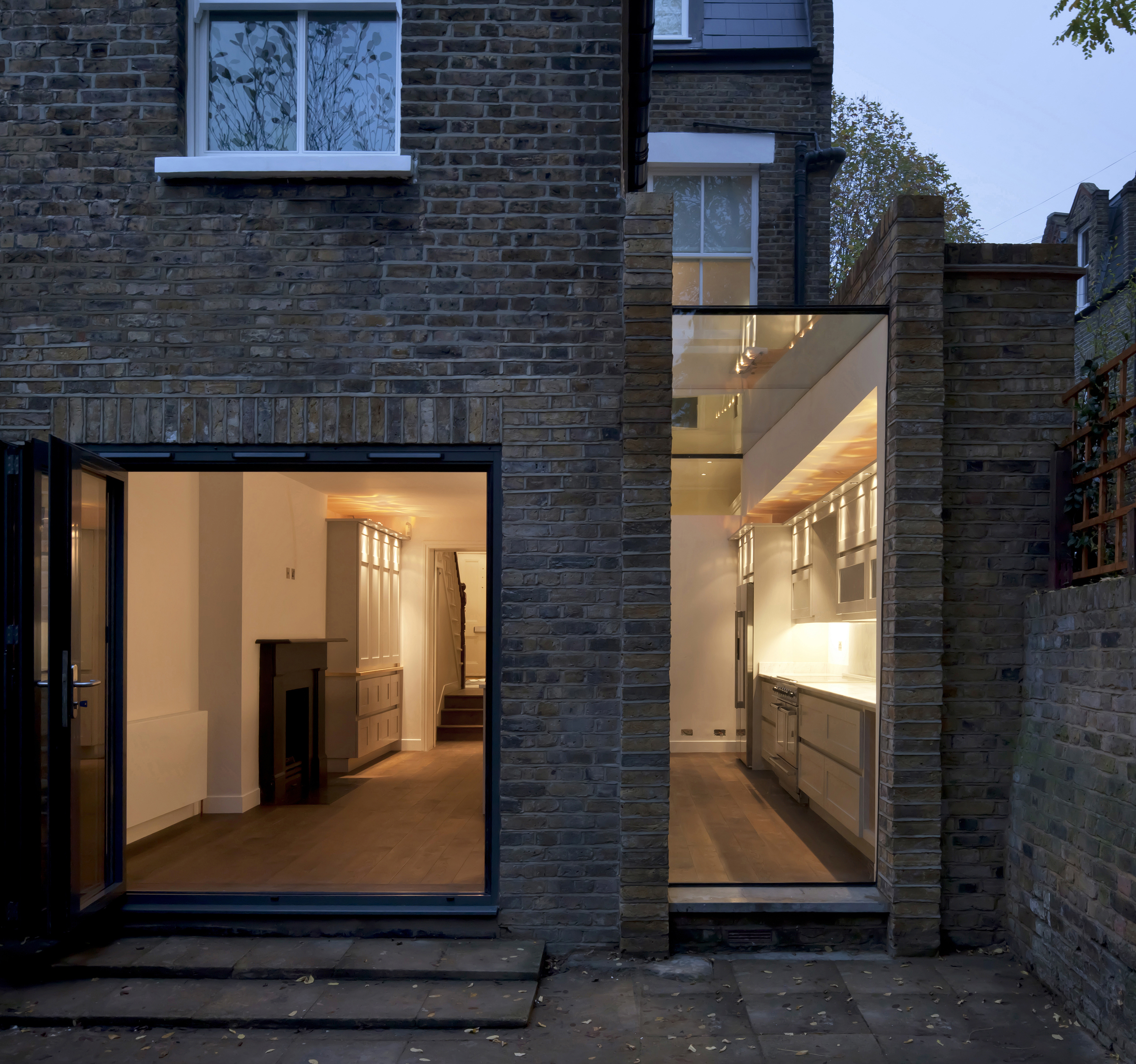 AndArchitects design forms a simple but beautifully detailed extension to the side of the house. The glass roof appears to slice seamlessly into the brickwork with flush internal and external finishes either side. The location and detailing of the glazed cut means that it is read as an intervention against the original building.