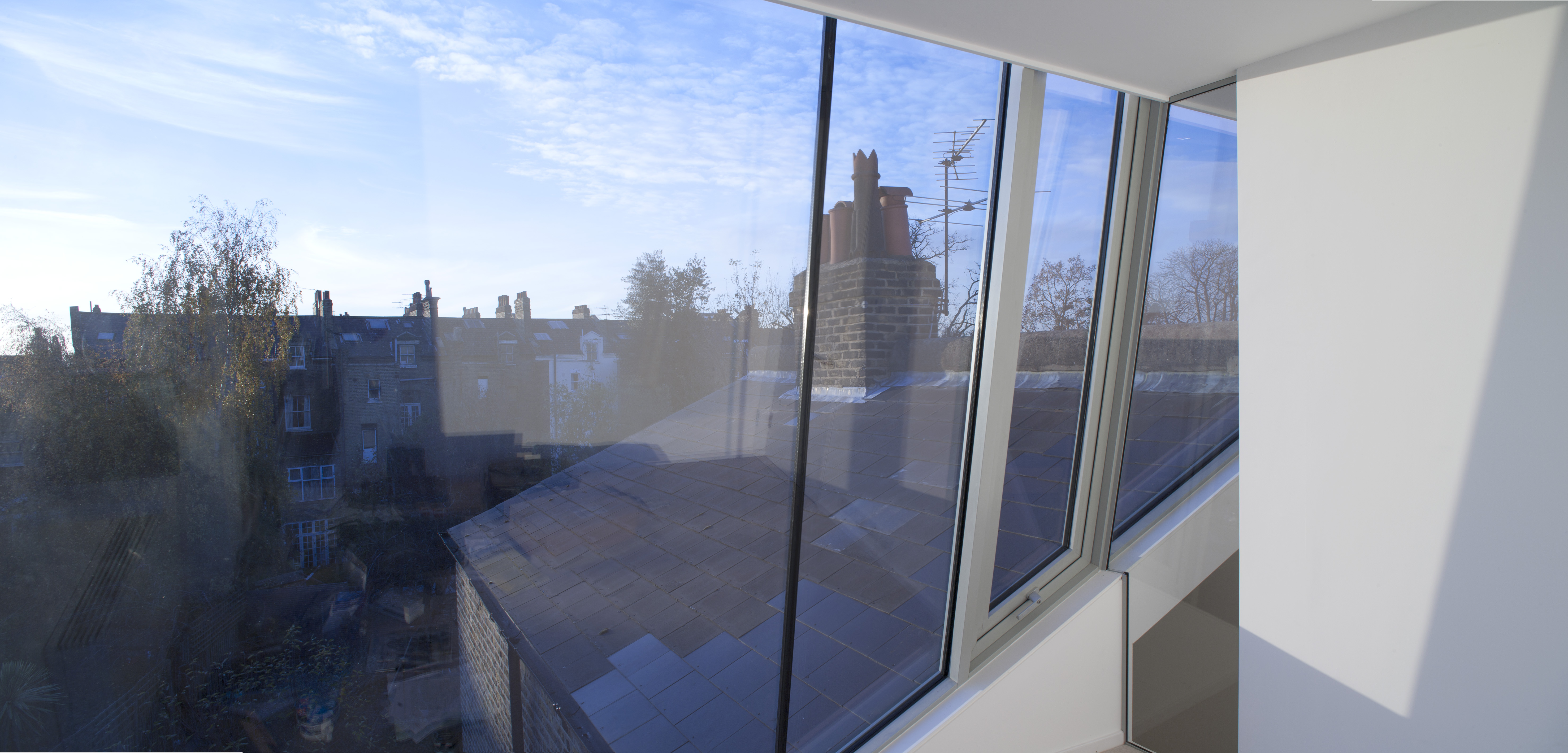 The resulting accommodation in the former attic space is both light and spacious and offers spectacular panoramic views over the rooftops of Wandsworth.