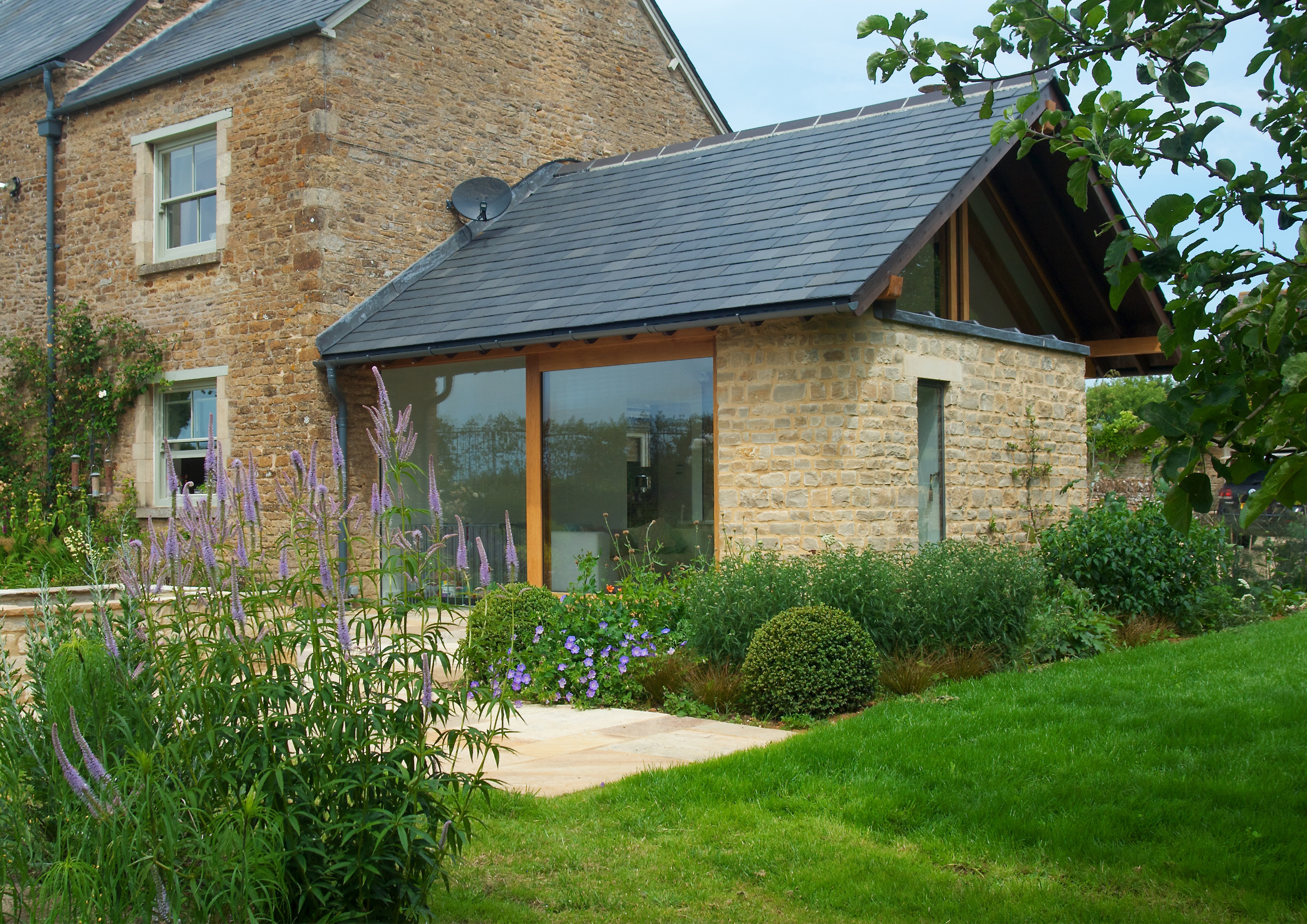 Phase 1 of the work, completed in November 2010, consisted of the construction of the new garden room to the east gable. The extension enjoys panoramic views of the landscape beyond in addition to focussing morning daylight deep into the building plan via the full height gable glazing.