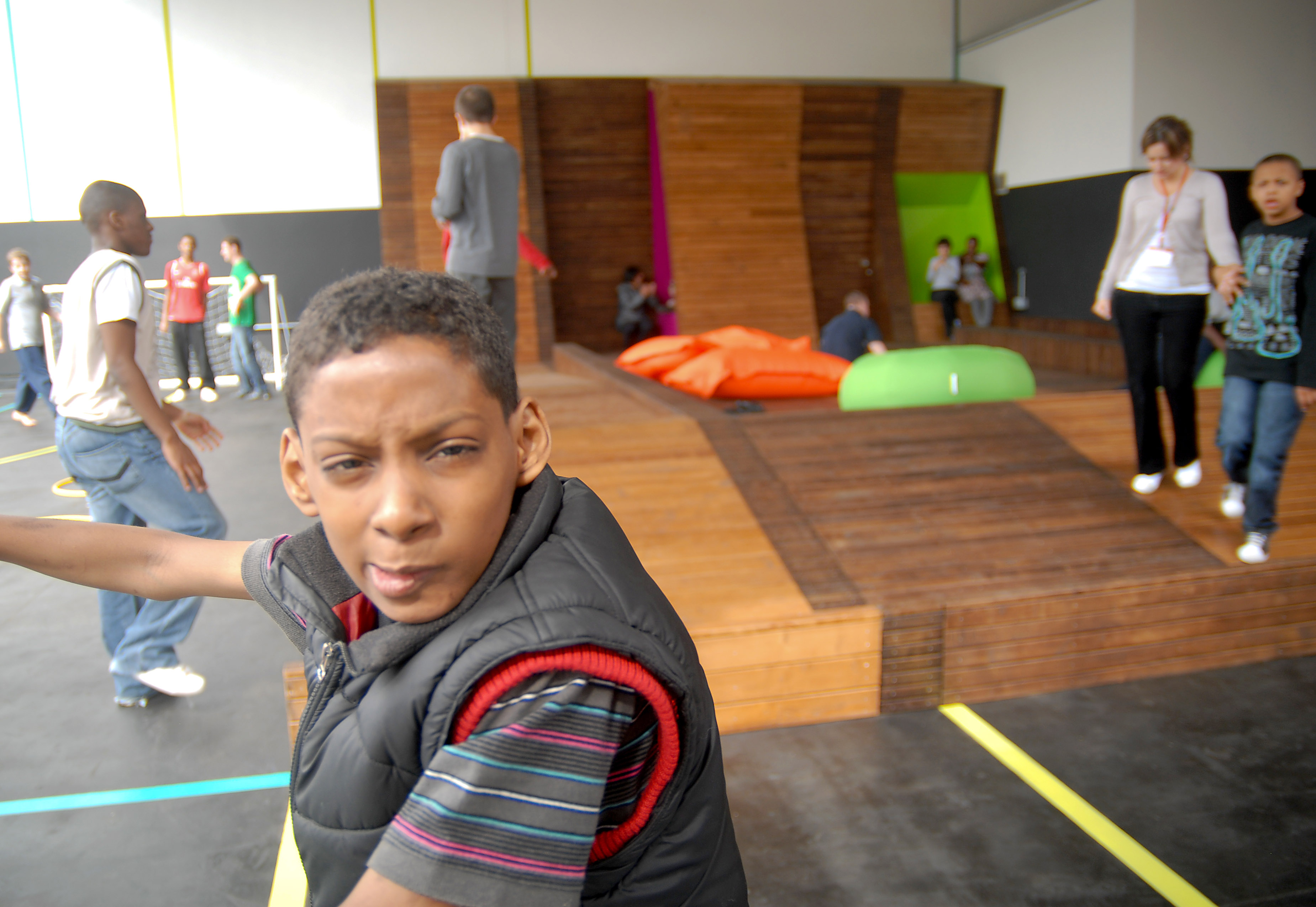 The Lower Playdeck on the 1st floor was being used by children with greatly varying physical capabilities. The principle design aim was to separate the space between fast and slow play so that children who simply wanted to sit, chat, lie down, listen to music or manipulate a sensory board had space to enjoy these activities away from those who wanted to run, play football or ride bikes. This separation was achieved by creating an undulating ‘timber field' with coloured seating pockets. The field is formed from three widths of timber strip creating a landscape of varying texture to explore. The gentle variation in angle and depth provides subtle physical challenges for kids with limited mobility. The space is tied together with brightly coloured lines for children to follow, particularly those with autistic spectrum disorders.