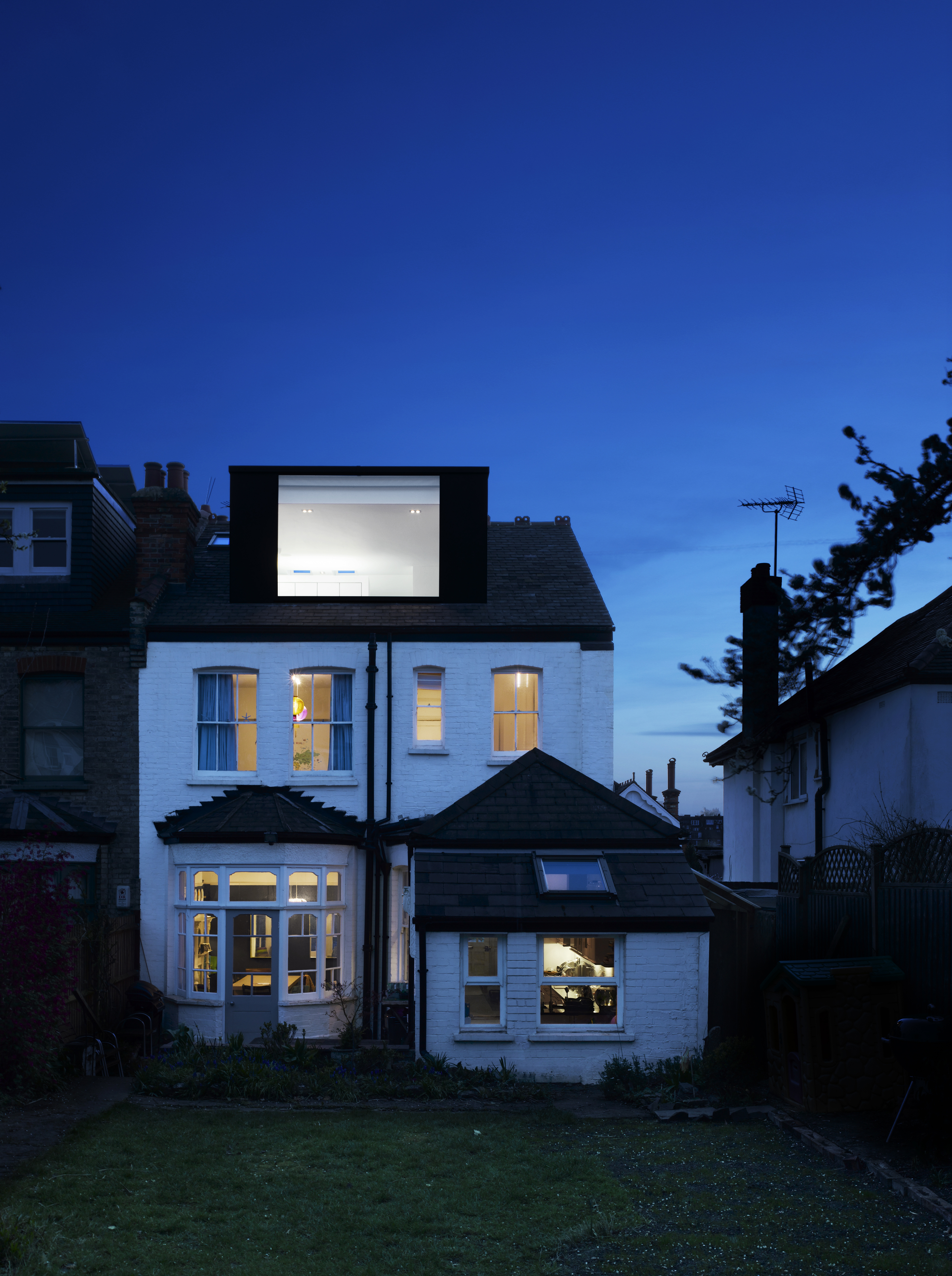 A black-clad dormer extension to an end of terrace Edwardian house in a conservation area creating a master bedroom suite and study.