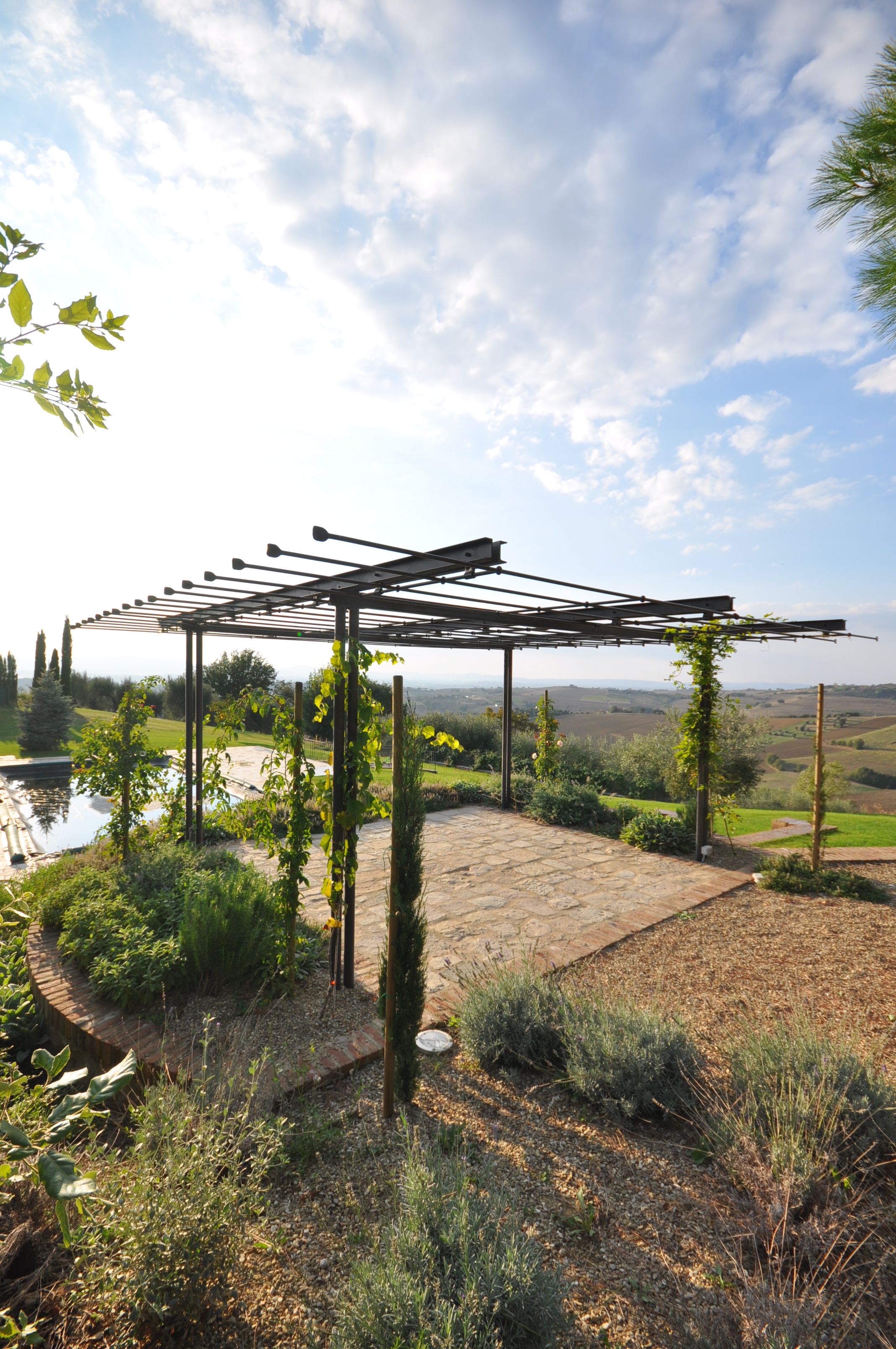 A belvedere terrace and steel pergola in the garden of a farmhouse in Umbria