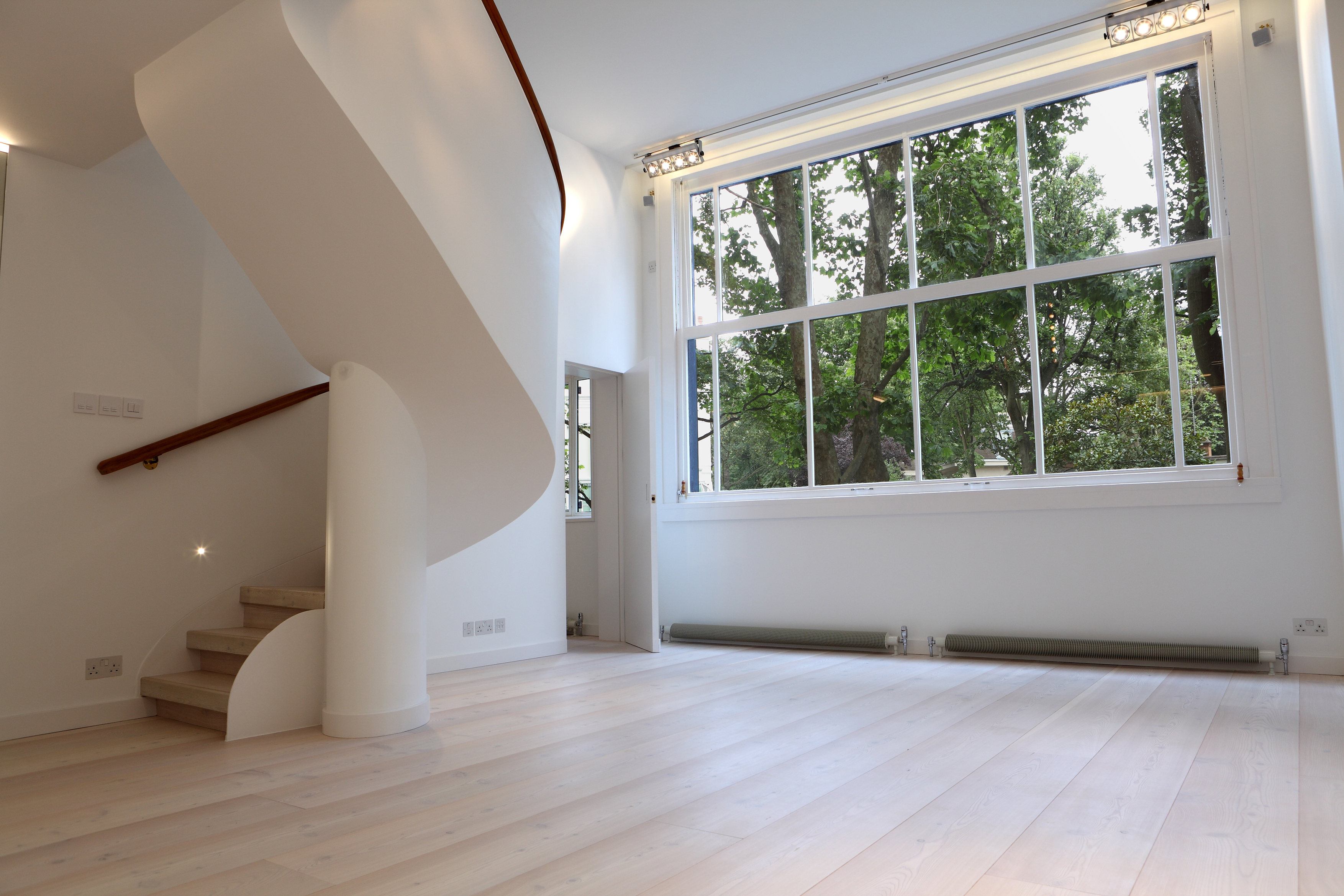 The brief called for a contemporary refurbishment sympathetic to the Modernist intentions of the original architect. The apartment has been meticulously renovated by mwai in a contemporary minimalist style aimed at enhancing the inherent architectural qualities and emphasising existing features such as the spiral staircase and the over-sized wooden sash windows.