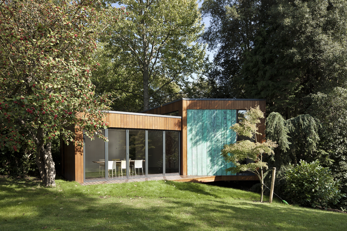 Summer House in the grounds of a building designed by and for renowned modernist architect Peter Moro. 50sqm timber frame building in a conservation area set in a mature garden setting.