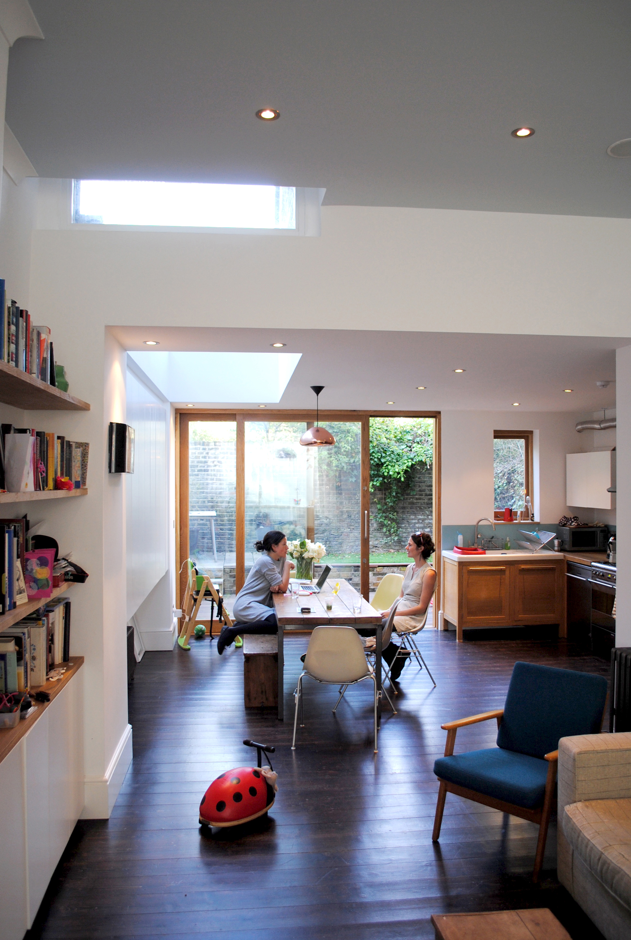 Thoughtbarn was commissioned by a graphic designer/lawyer couple with young children to convert two flats in a North London terrace into a family home.