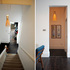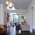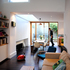 The ground floor was opened up with a series of strategic moves to better accommodate contemporary family living. For example, the typical narrow entrance corridor was widened to make an entry vestibule and separate mud-room for storing bikes and prams. A desk was placed along the shop-front windows so that a business could be run from the front of the house. Meanwhile the utility room and dividing walls at the rear of the house were removed to make one generous kitchen, living and dining area. A glass roof-light, big sliding doors and strip of glass floor distribute much-needed light to the renovated spaces.