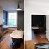 In collaboration with the clients, much effort was made to use reclaimed materials. The kitchen cabinetry was salvaged from the first floor flat and reconfigured for the new ground floor kitchen. The media cabinetry and shower tile were sourced from an architectural salvage yard - and a clawfoot tub was restored for the new master bath (previously the first floor kitchen).