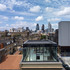 A steel and glazed box, with no external finishes and no visible roof, sits on the third floor, set back from the building edge inside the line of the existing masonry walls.