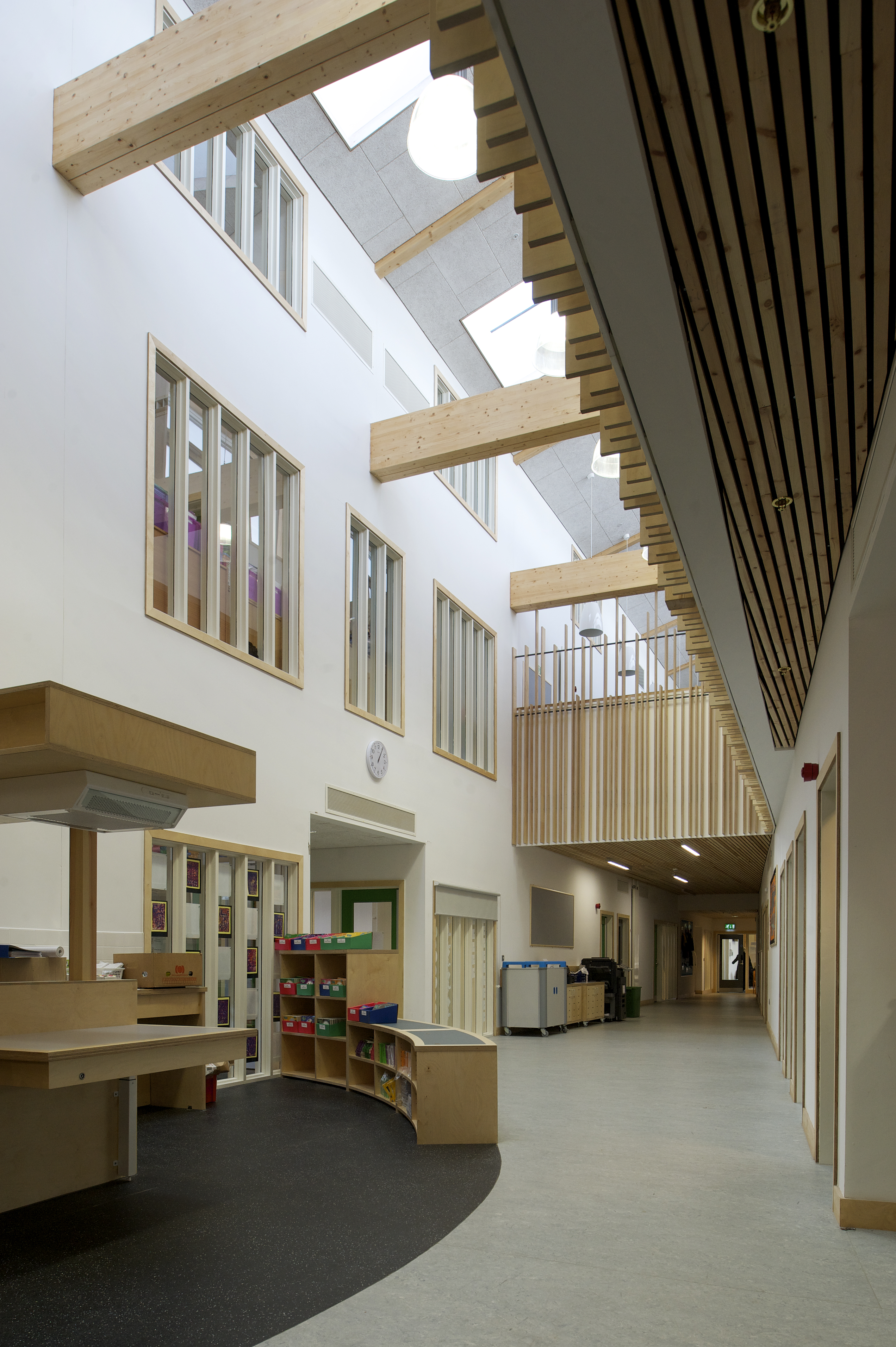 The artwork within the school has been created by the pupils, including engravings on the timber frame and the main staircase.