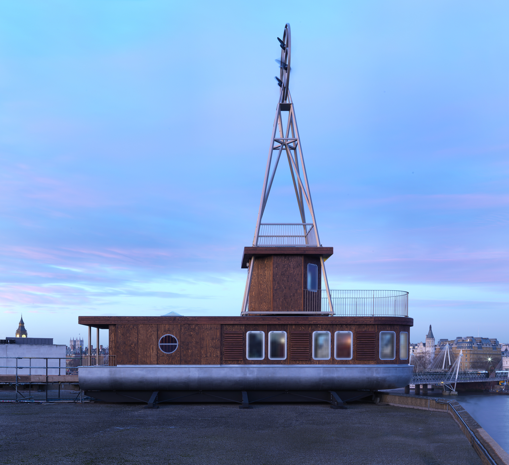 Temporary boat-shaped holiday home positioned ontop of the Queen Elizabeth Hall on the South Bank as part of the Living Architecture program