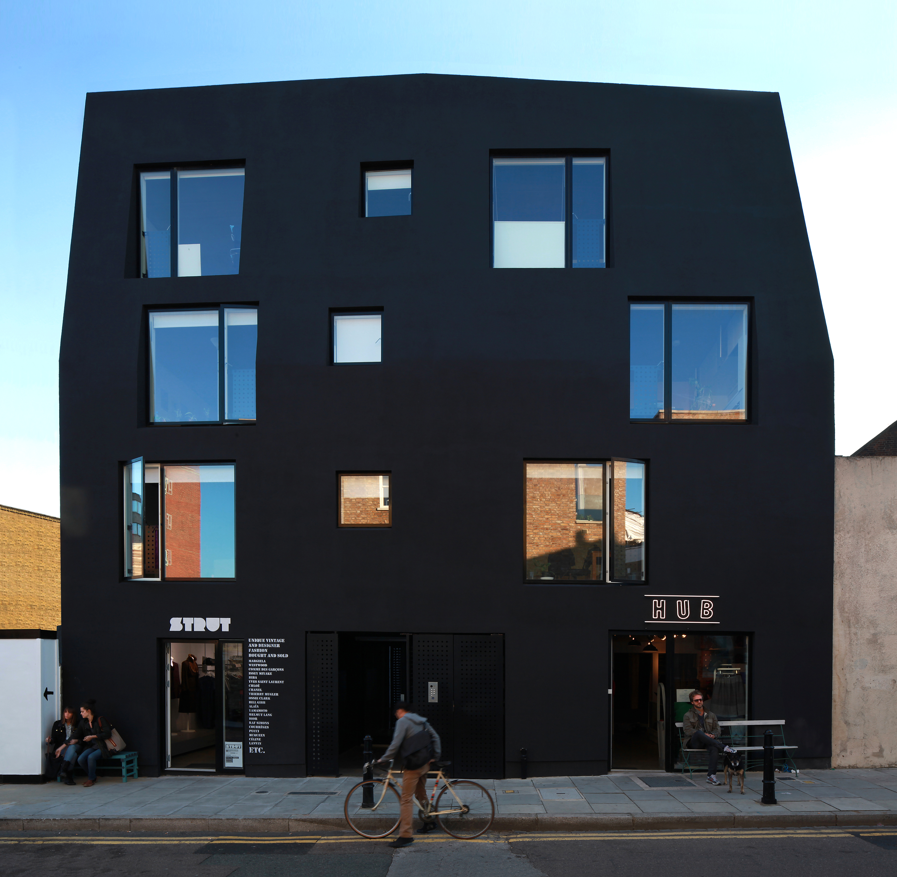 Asymmetrical four storey residential and retail development with inclined black rendered walls and a random arrangement of large, reflective windows