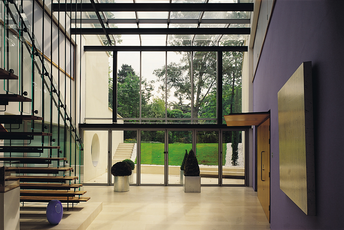 Between the two wings a partially subterranean glazed hall acts as the main entrance and core of the house. From this hall there is access to a swimming pool that shares the basement level with three garages.