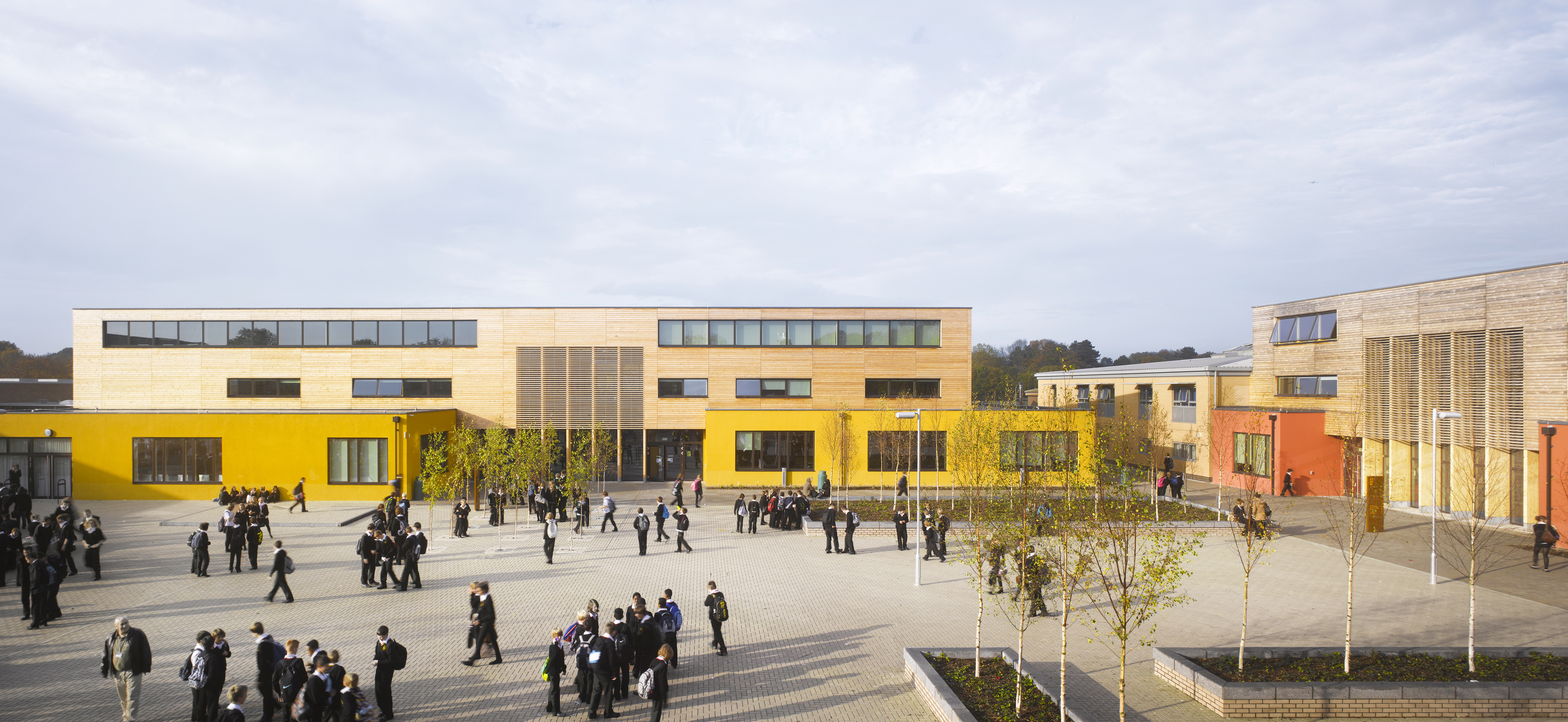 Timber framed and clad school organised in four blocks around a central outdoor court