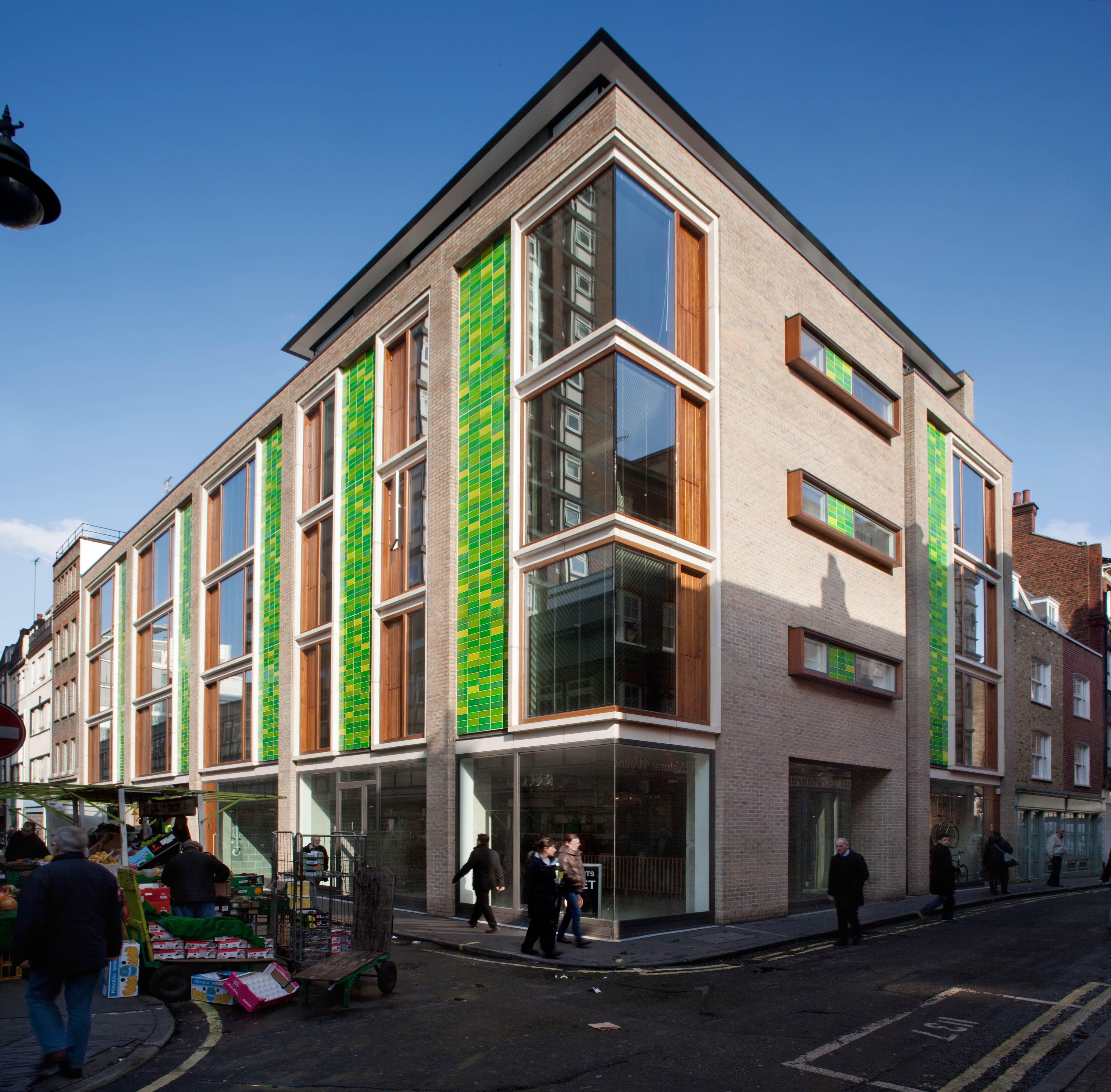 The pattern of the glazed tiles refers to the colours found in the Berwick St Market. A series of photographs taken of the market stalls are pixellated into squares of single colours. These squares are then stretched to the proportion of a tile and used to enrich the façade.