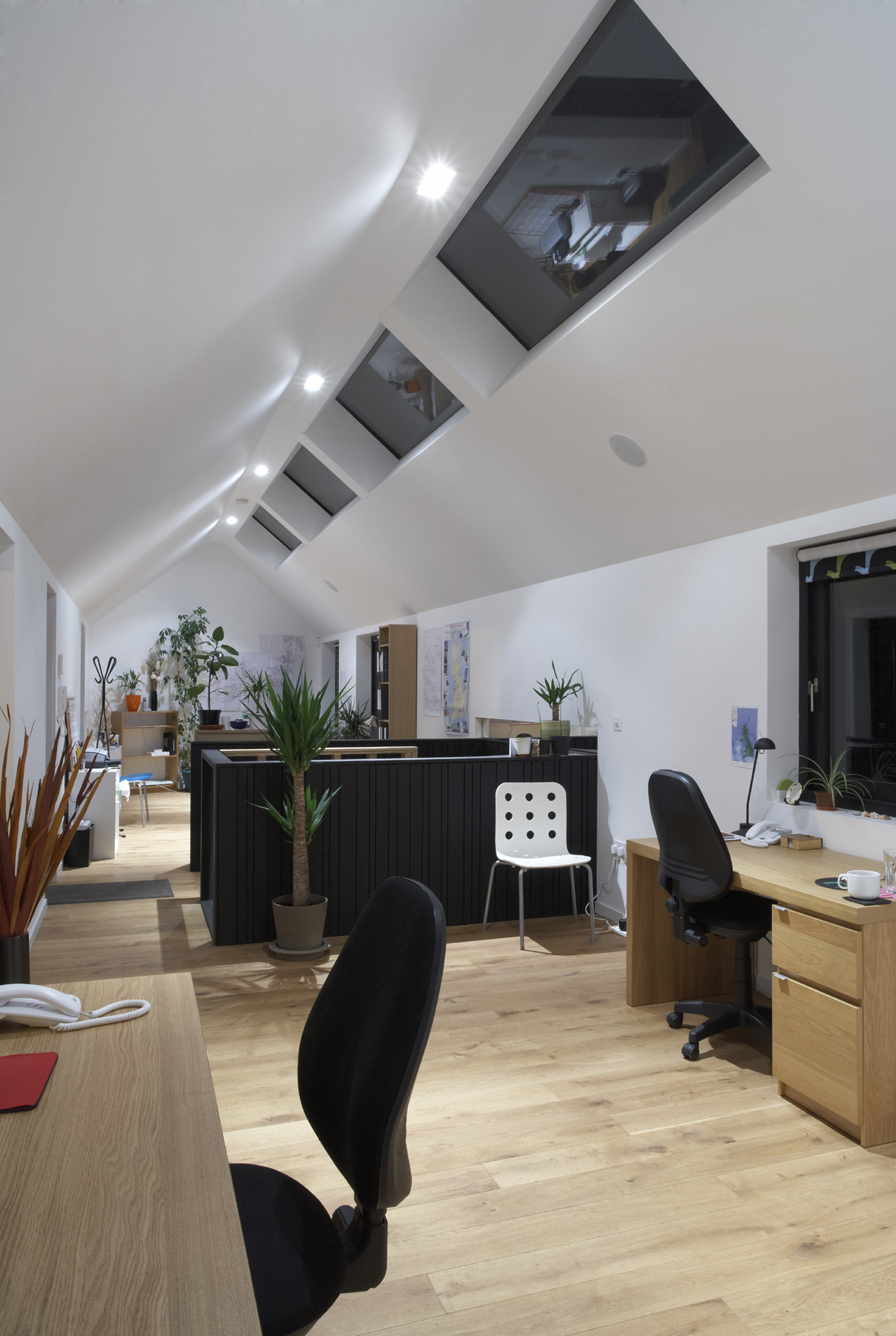The building was raised a little, so that the entrance from the lane could provide access to a further office level above, with frameless gazed rooflights and windows looking onto the lane and the back court.