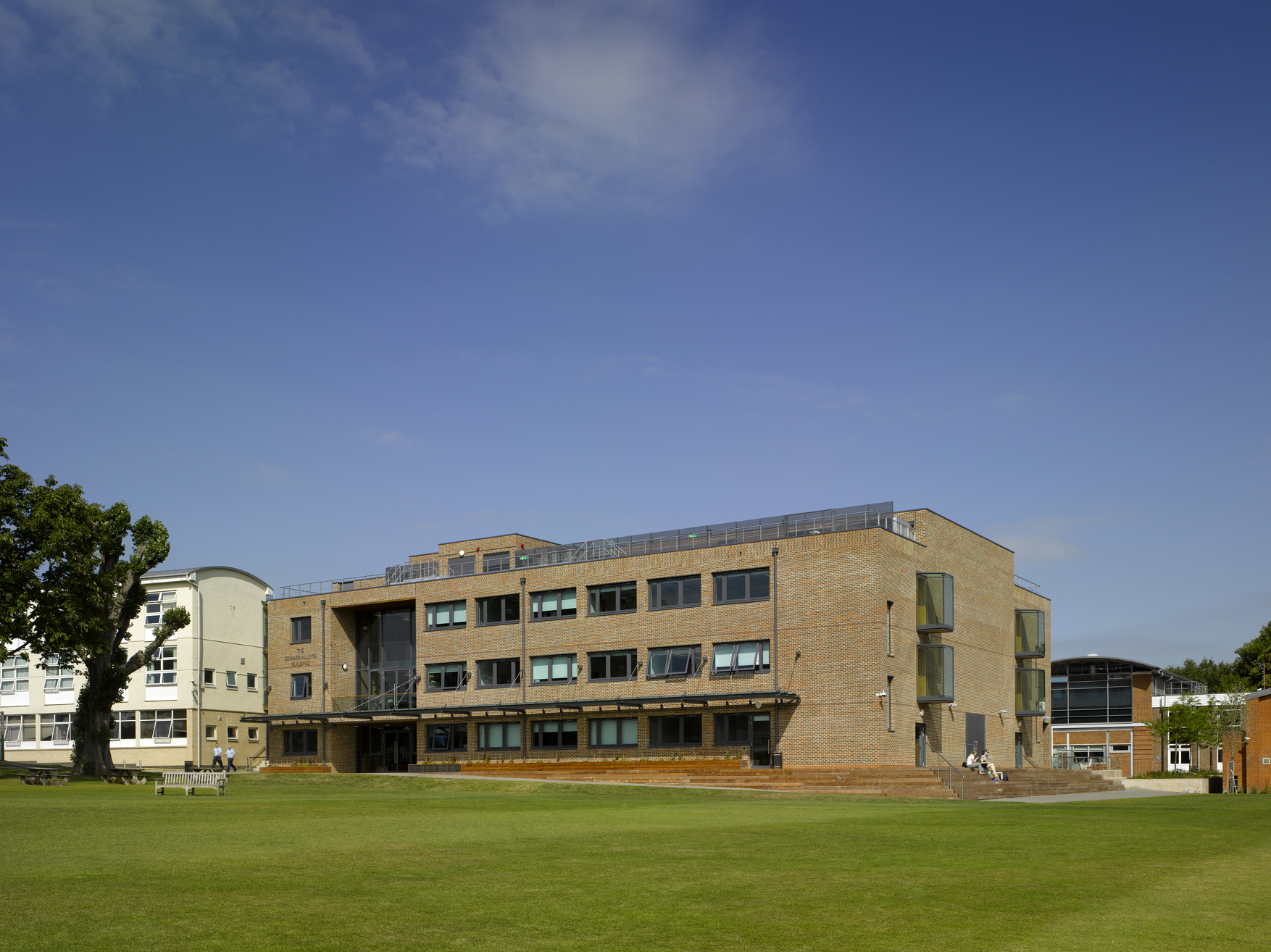 The foyer, a top-lit three-storey atrium space with glazed facades, provides views over the school grounds. From the foyer a new terrace opens out, allowing views over the playing fields.