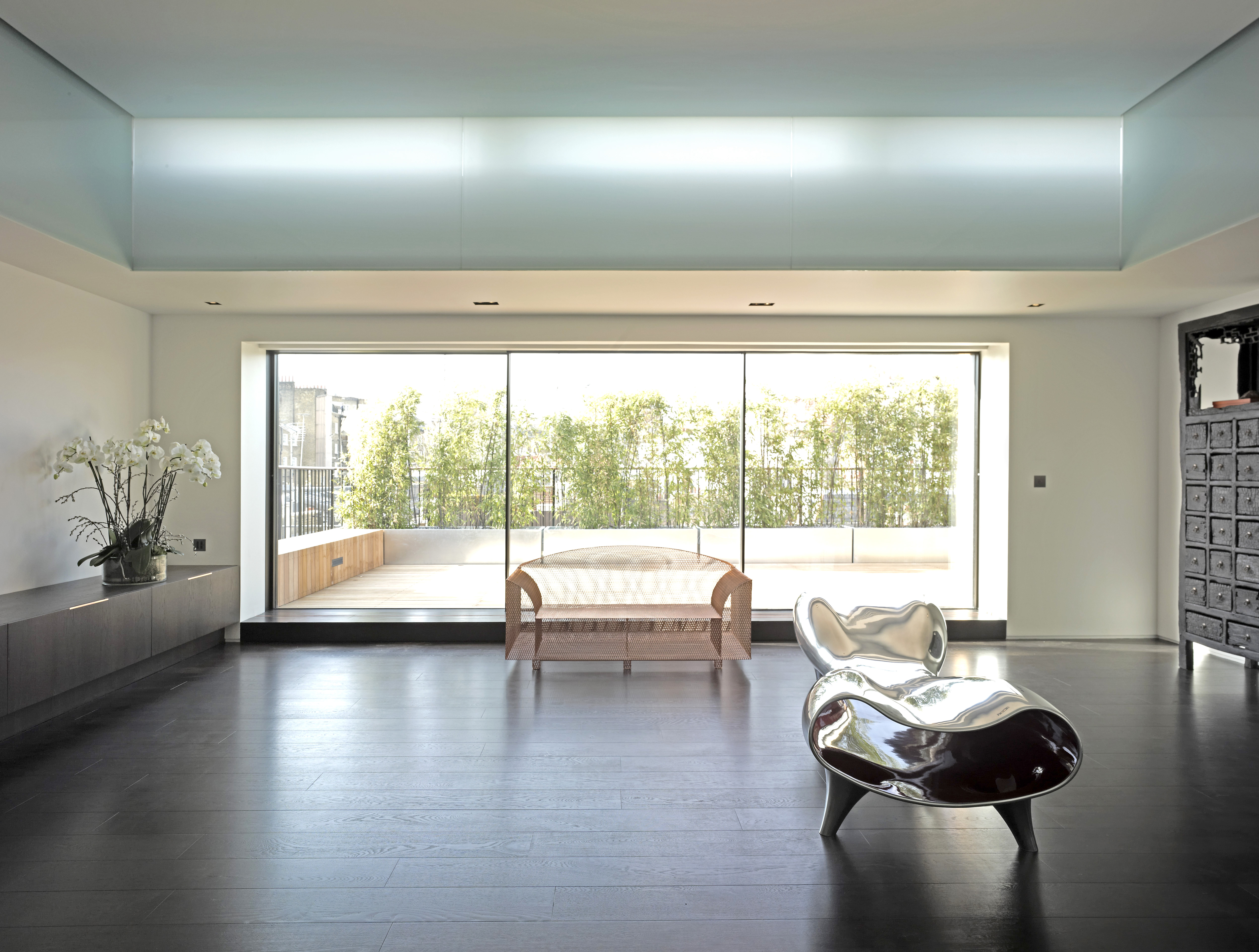 Accommodation is arranged across two floors. The upper level is open-plan, providing an office and living room that opens on to a roof terrace with rooftop views of London.