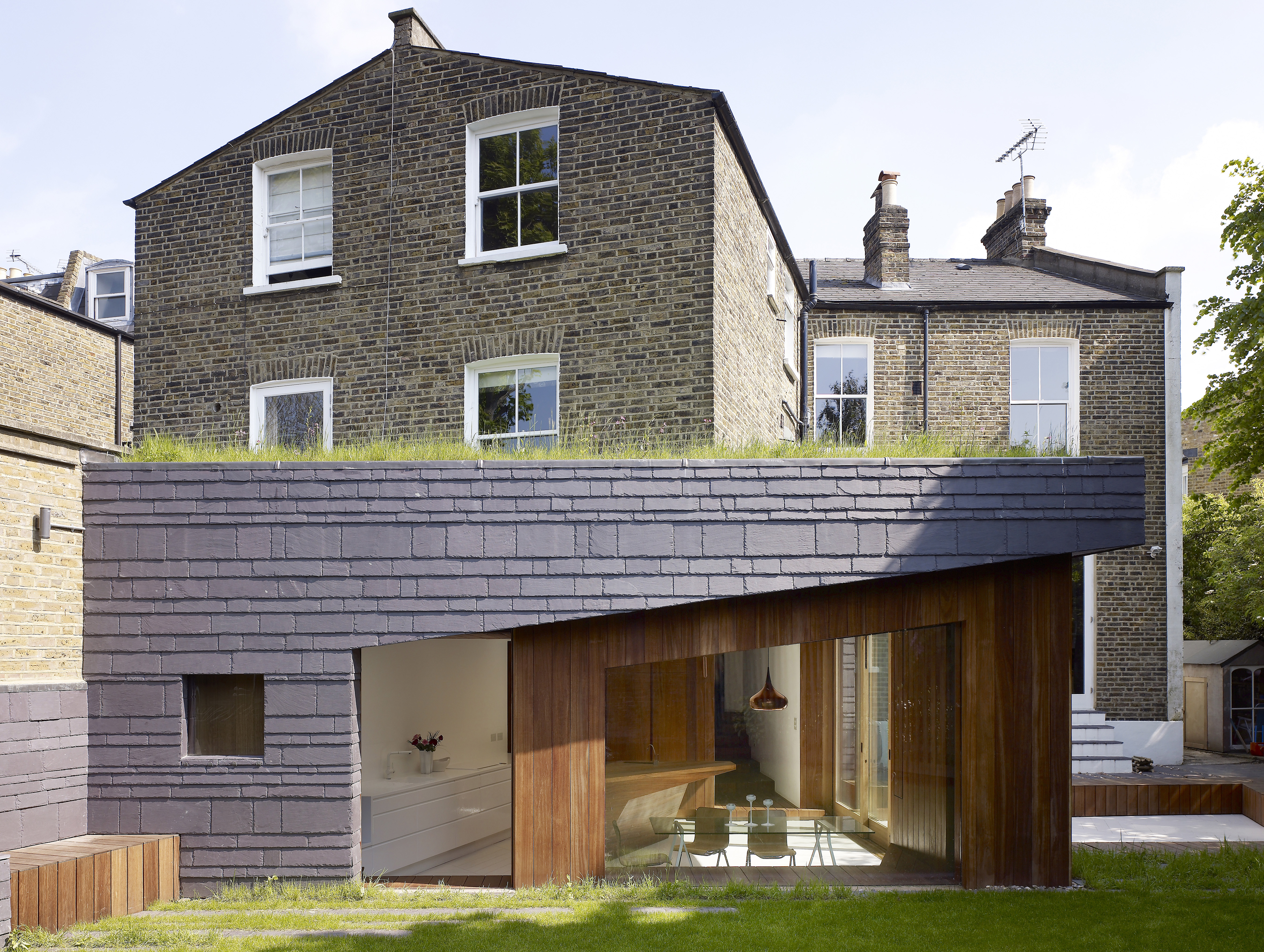 Single story extension with a tilted wild flower turfed roof located within a conservation area