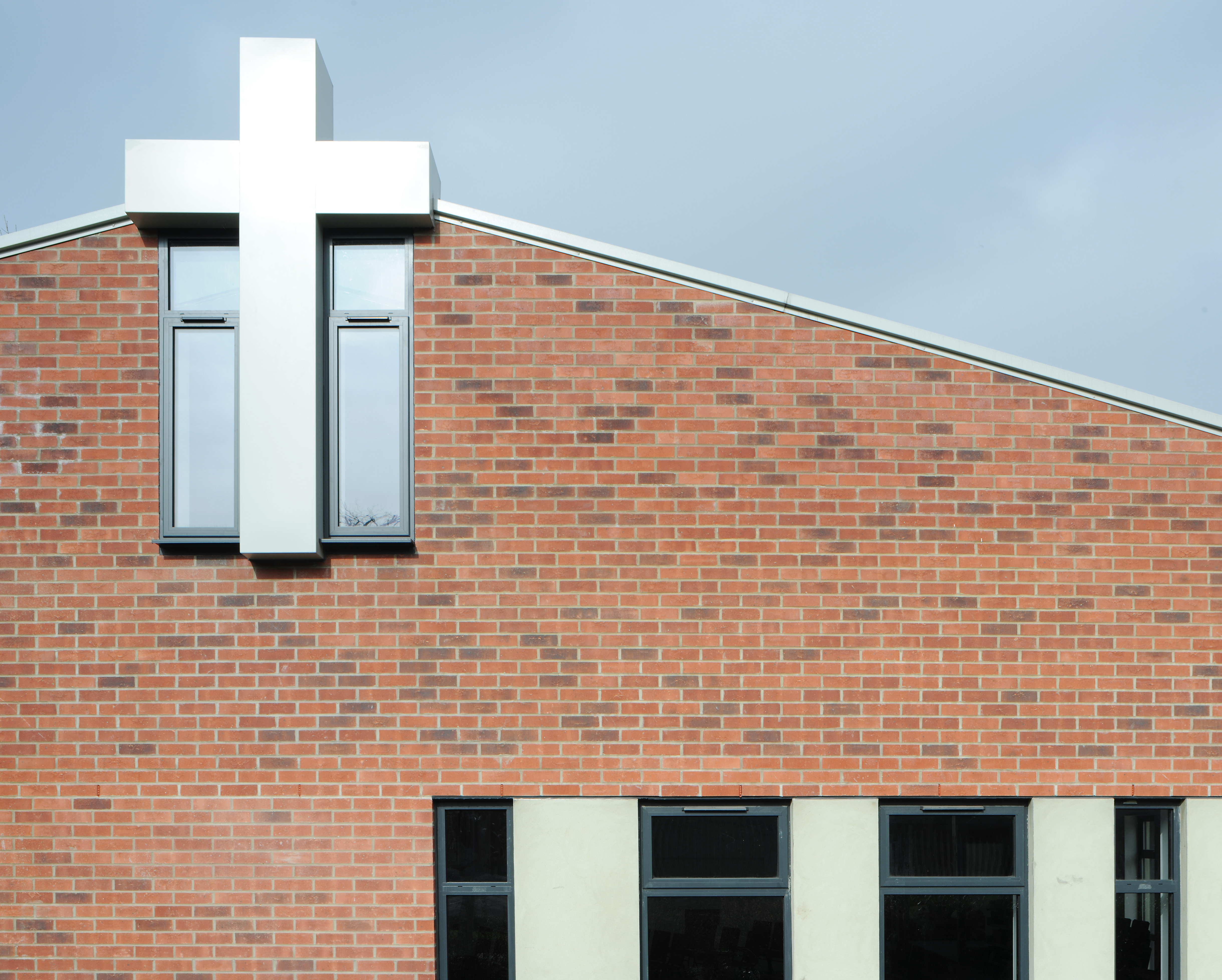 The extension, which is formed of two elements, wraps around the existing building and conceals it form the street. A brick clad building with a pitched roof contains the main worshiping space, while the main entrance area and connection between the extension and existing building is enclosed by a flat rendered roof.