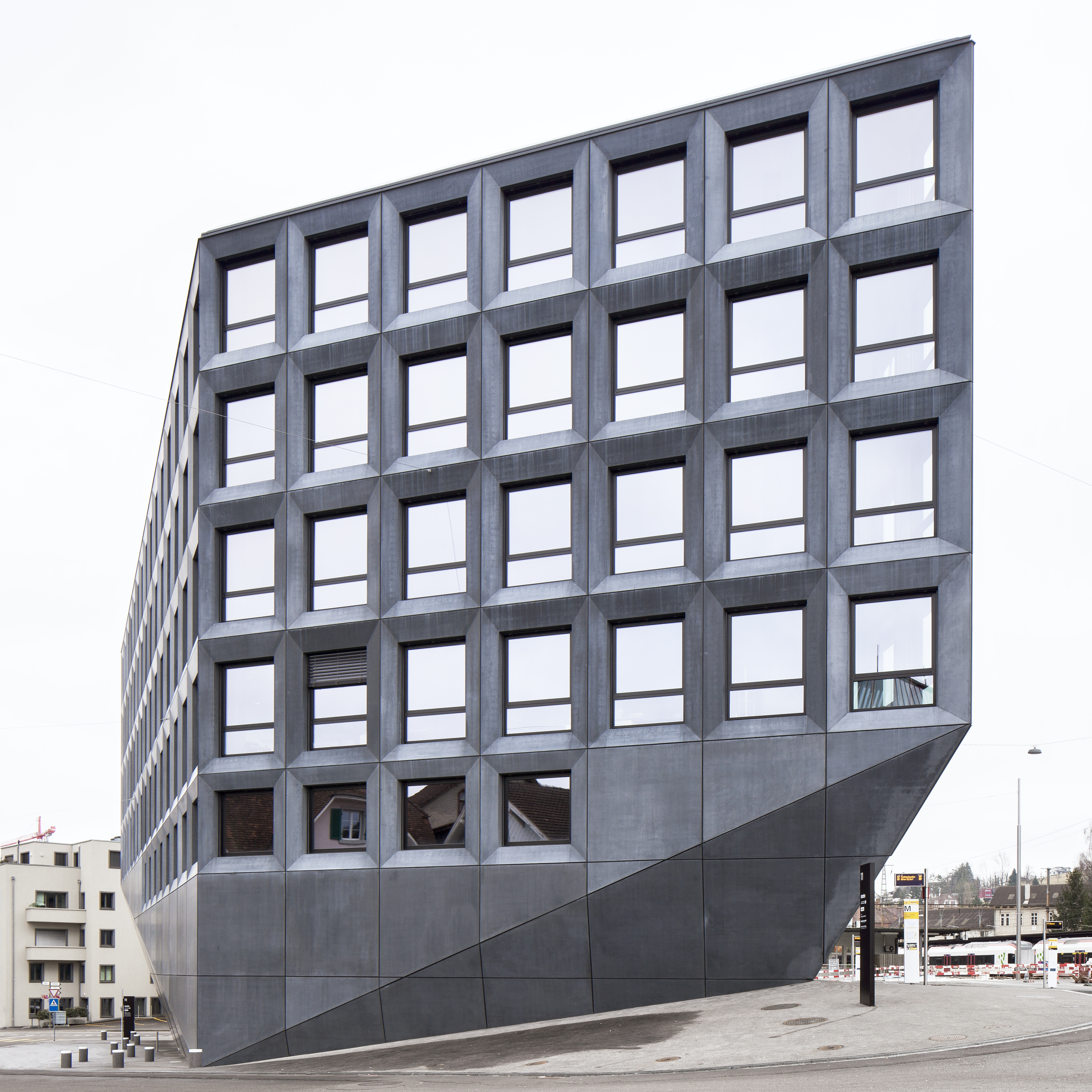 The block occupies a site between the Liestal station square and the head office of Basellandschaftliche Kantonalbank. Due to the constrictions of the site, the building’s footprint had to be smaller than its upper storeys, resulting in a downward tapering shape.
