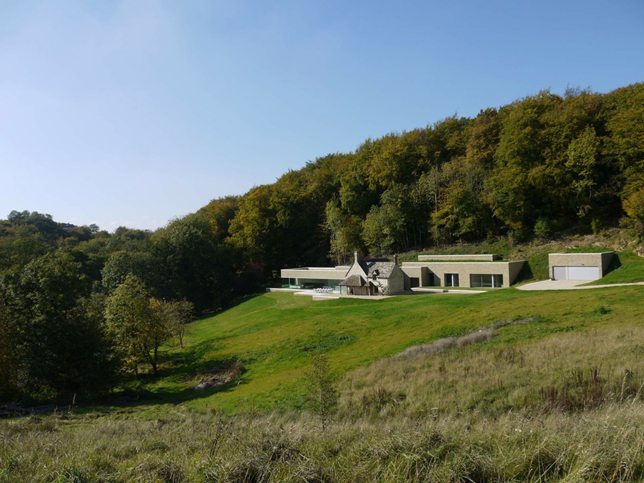 The lower section of the extension to the west houses the main living and entertaining areas, and the higher section to the east, which is further recessed into the hillside and has a planted green roof, contains the bedrooms and bathrooms.