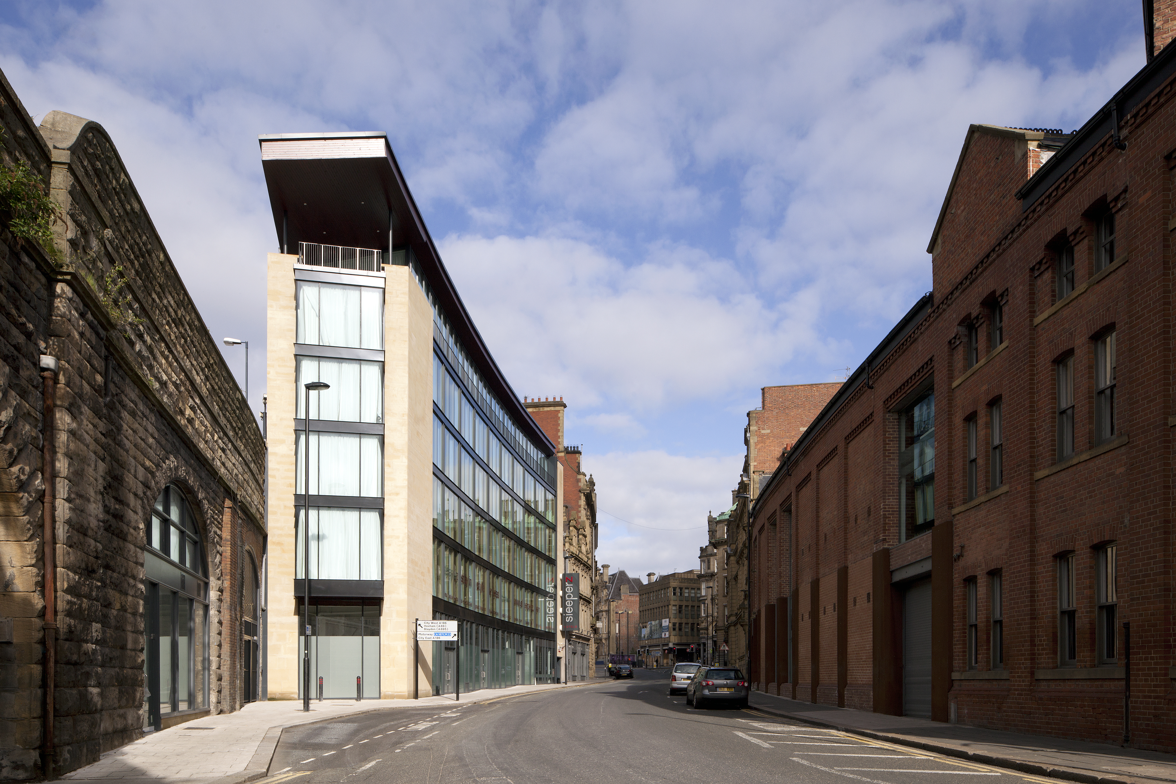 Built adjacent to the Grade II listed viaduct of Newcastle station the building extends into the arches below track-level to provide 1000 m2 of lettable commercial units on the ground floor.
