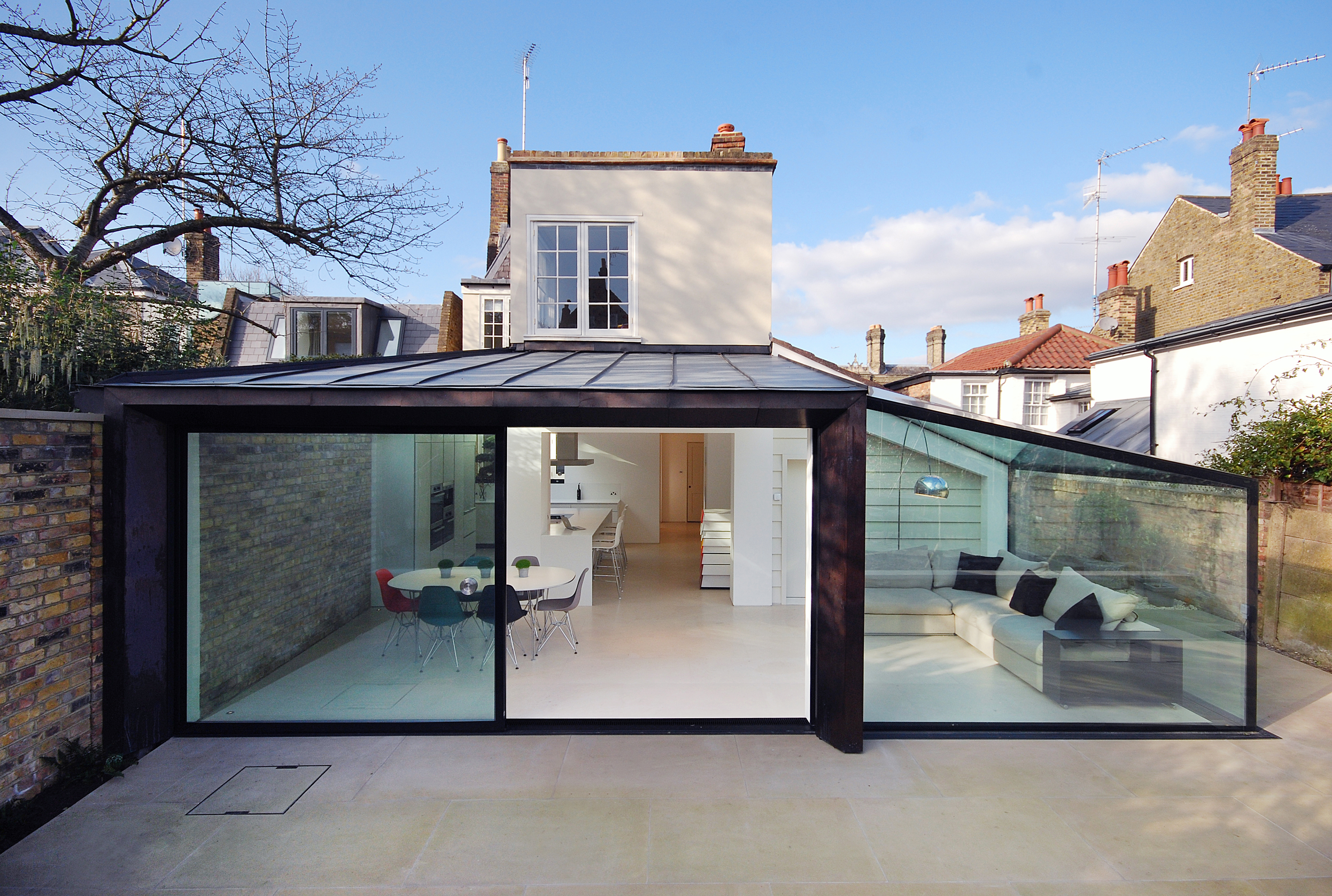 The glass extension contains a kitchen and dining room within a narrow copper framework, which has extensive glazing to provide south-facing views.