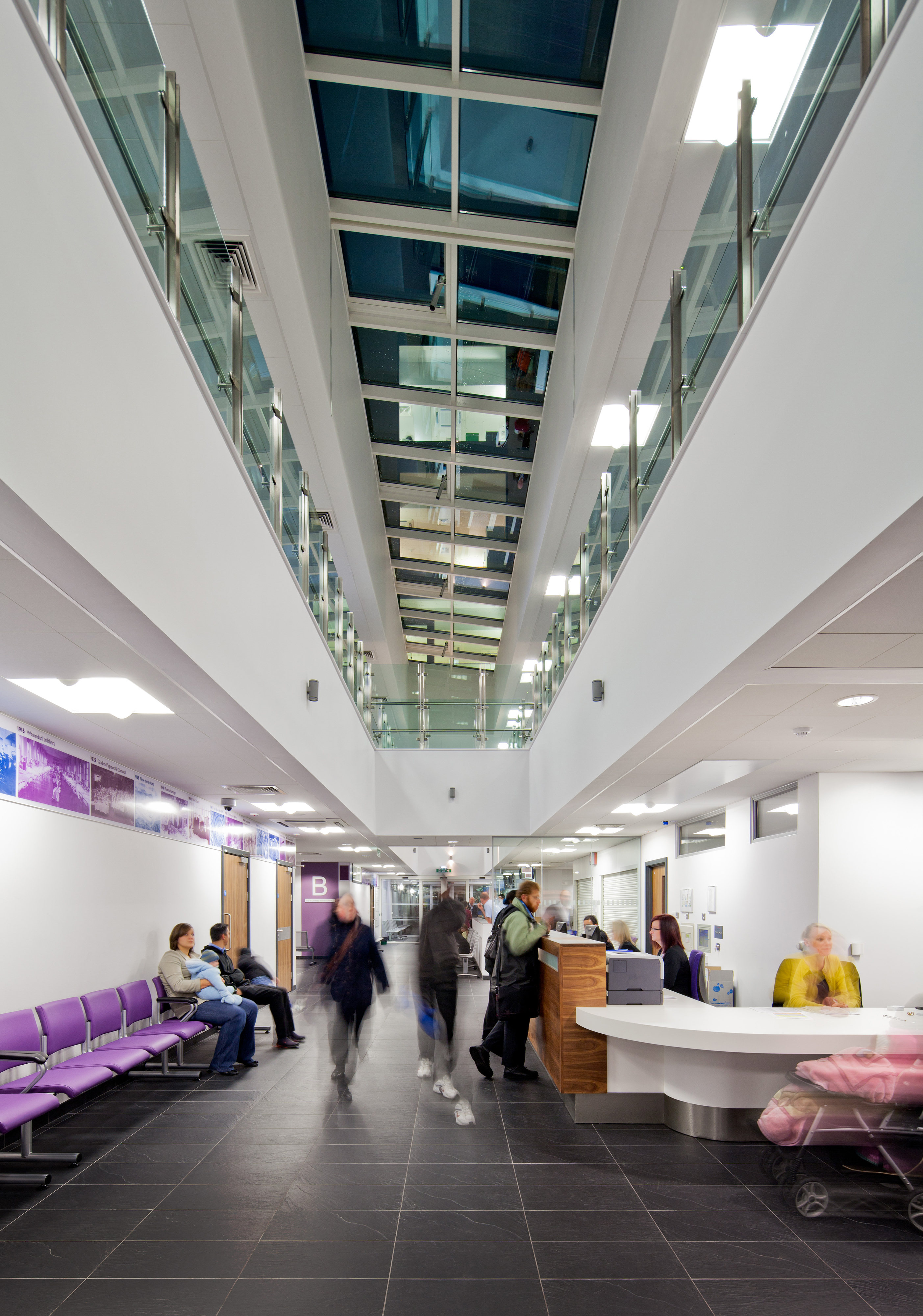 An internal street with double-height, sky-lit atria channels visitors through the building and improves orientation by displaying first-floor GP accommodation.