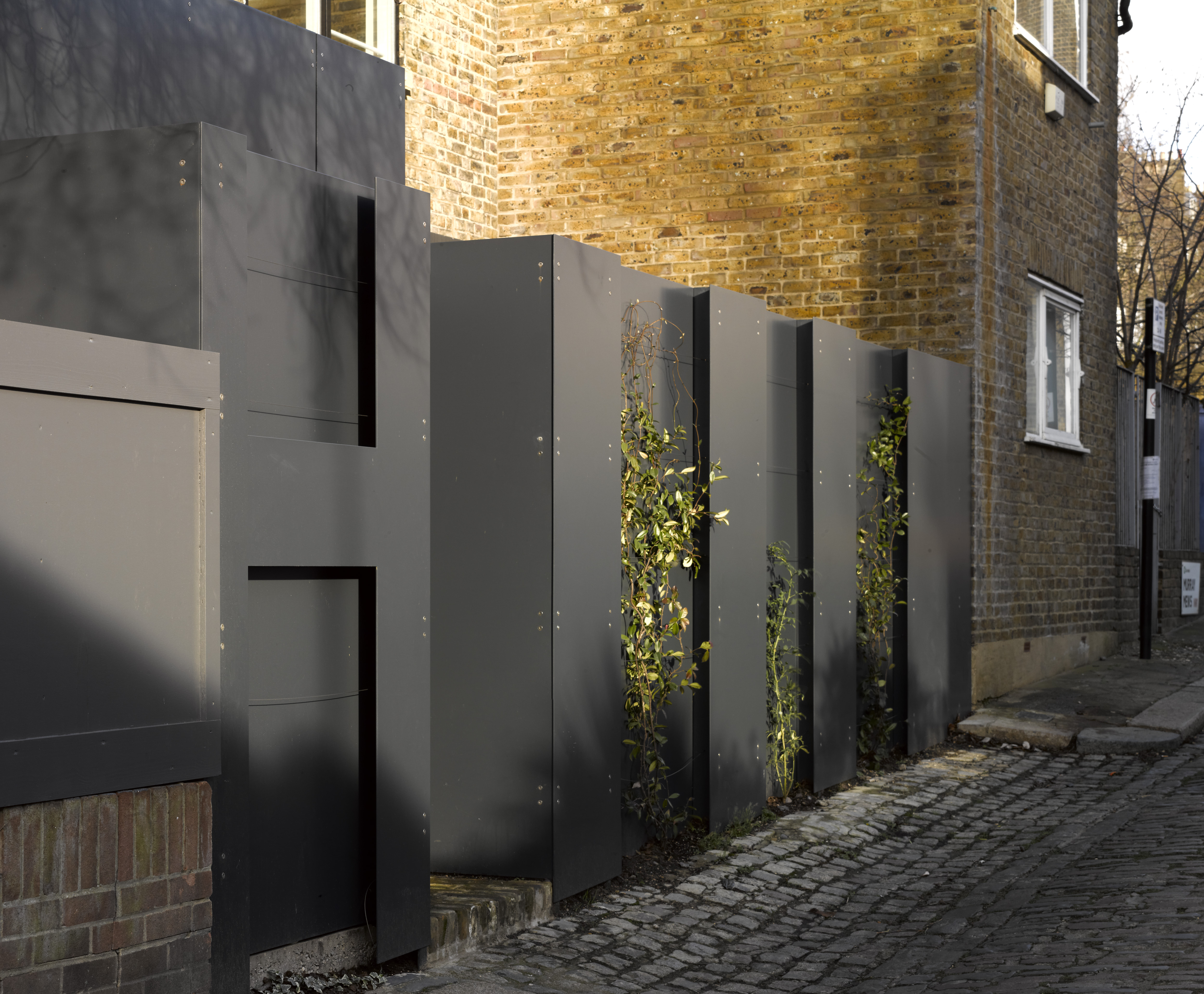 The vigorous nature of the mews streetscape is complimented by the tough materiality and direct simplicity of the boundary wall. The steel assembly is stepped in plan to provide structural depth while providing opportunities for planting in the recessed portions, presenting a soft green face to the interior.