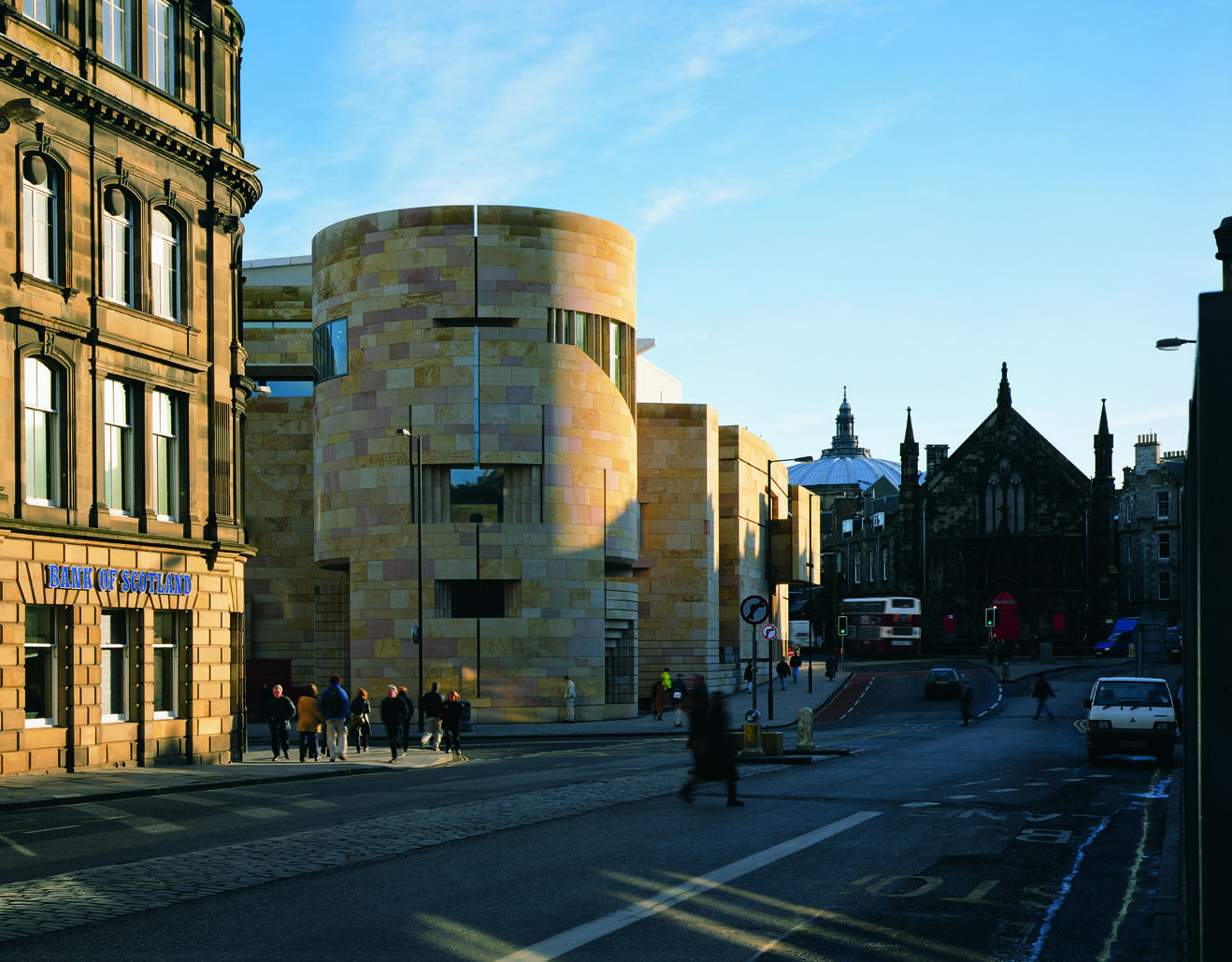 The double-walled cylindrical entrance tower draws on the imagery of the prehistoric north British brochs. The facades to Chambers Street and George IV Bridge are clad in an expressed veneer of Clashach sandstone. Walls are punched and pulled with slots, colonnades and cantilevered windows.