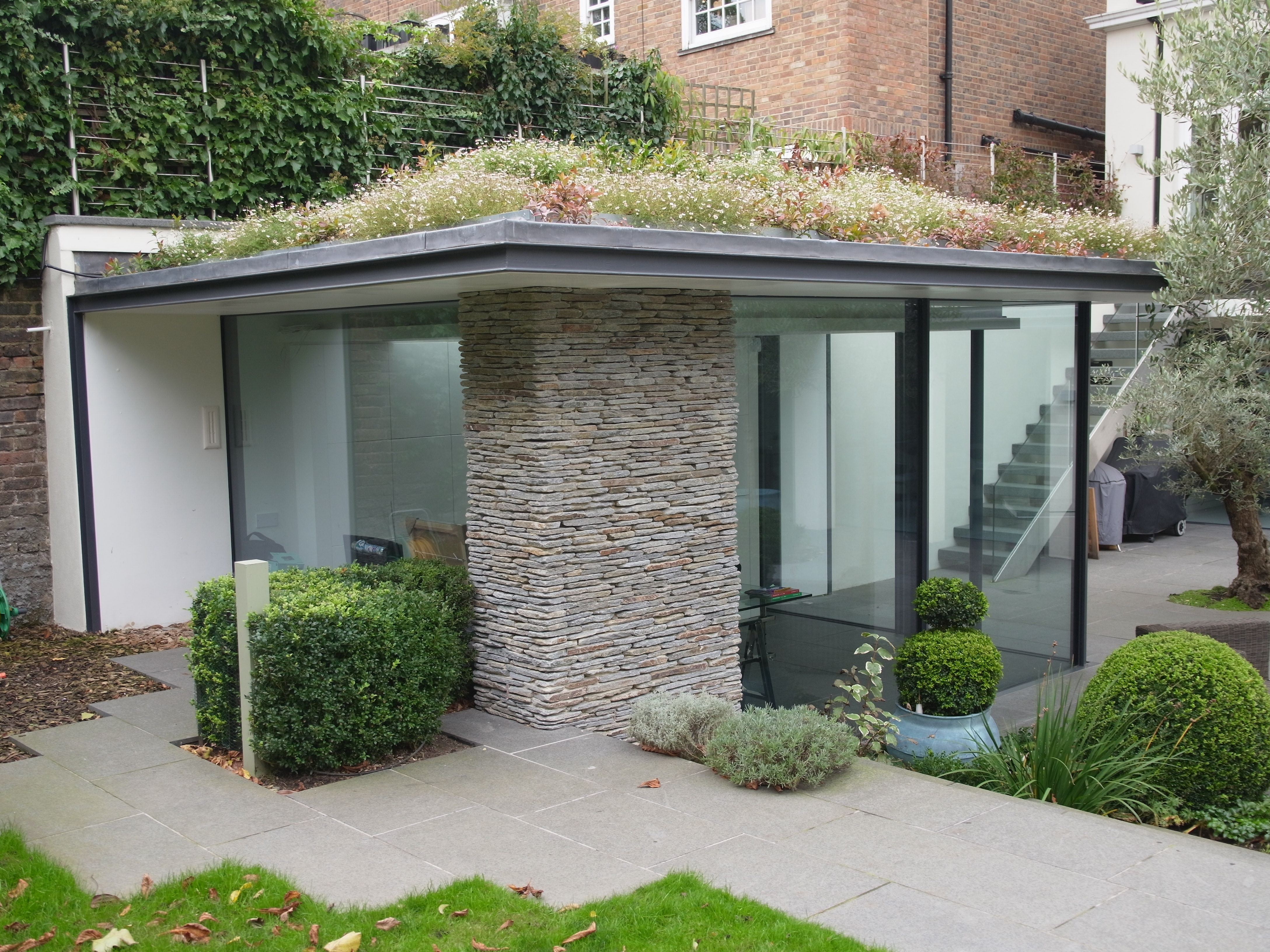 Constructed within the garden of a grade 2 listed townhouse, Queens Grove Garden Pavilion is a small, 15m2, glass and stone structure with planted green roof