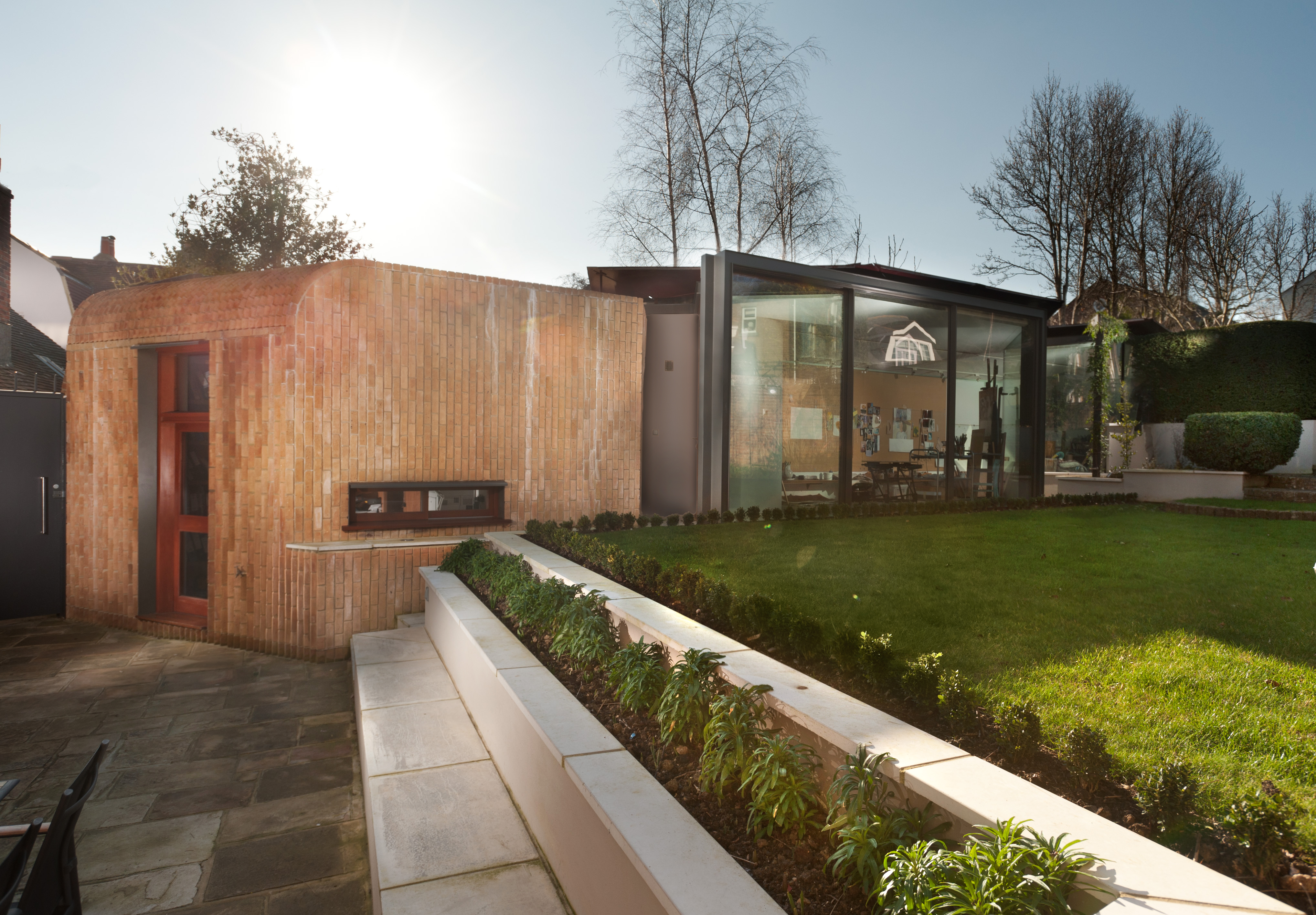 The material elements are restrained very clearly to brick, glass and steel. The Serrated Brick that wraps the volume including the roof defines the Study and wet-room. The Art studio is defined by a triangular oxidized steel roof over an arrangement of glass triangles (including a tiny art gallery) that opens to the mid terrace garden and bedded into the raised rear terrace garden. The artist can feel sheltered in the ground but creative to the sky.