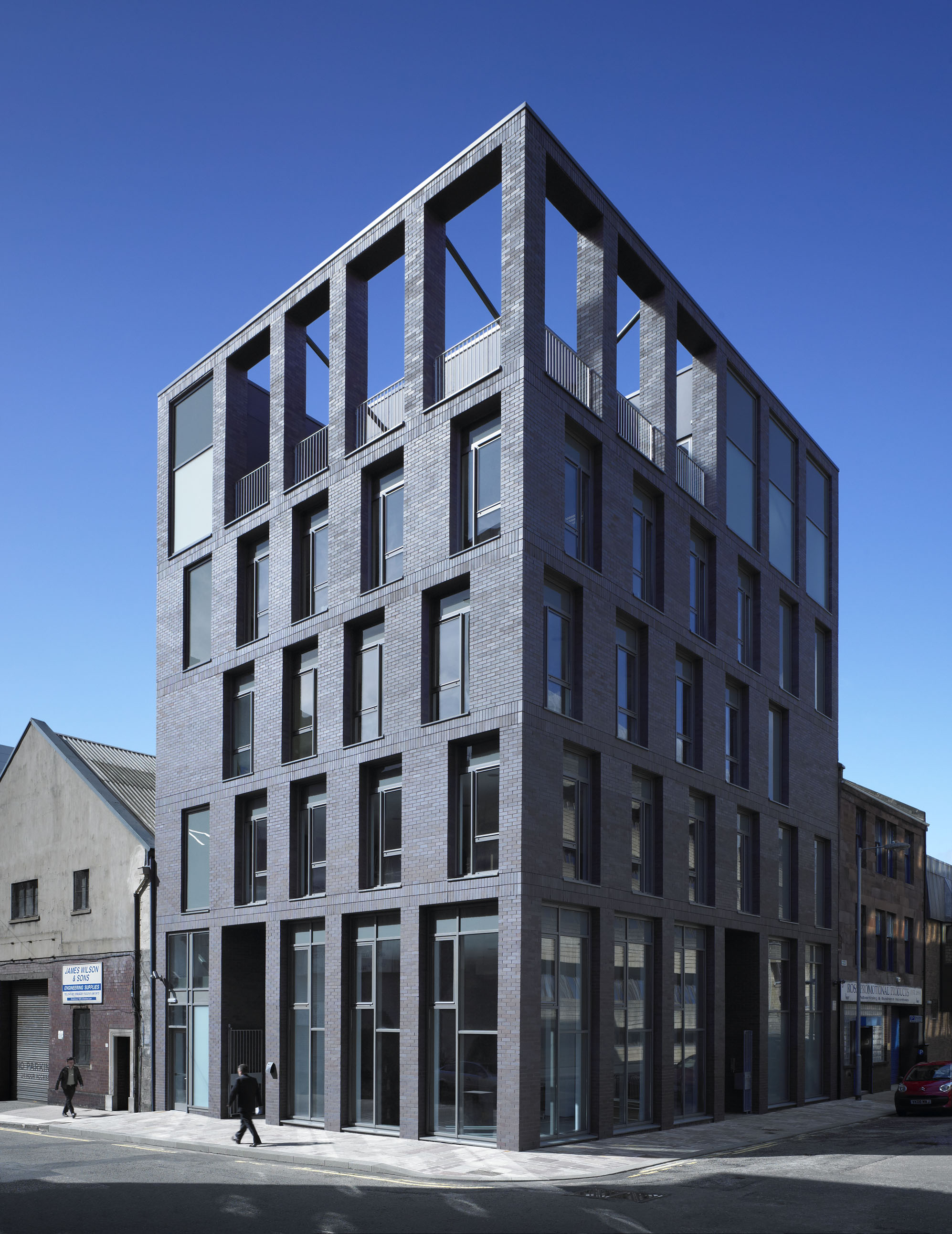 The building responds to its context with industrial materials; a robust steel frame clad in blue brindled brick continues the tone and texture of the historic warehouses. In elevation each floor is defined by a double soldier course and brick reveals deep enough to convey a sense of solidity, mirroring the historic buildings that make up Glasgow’s Victorian street grid.