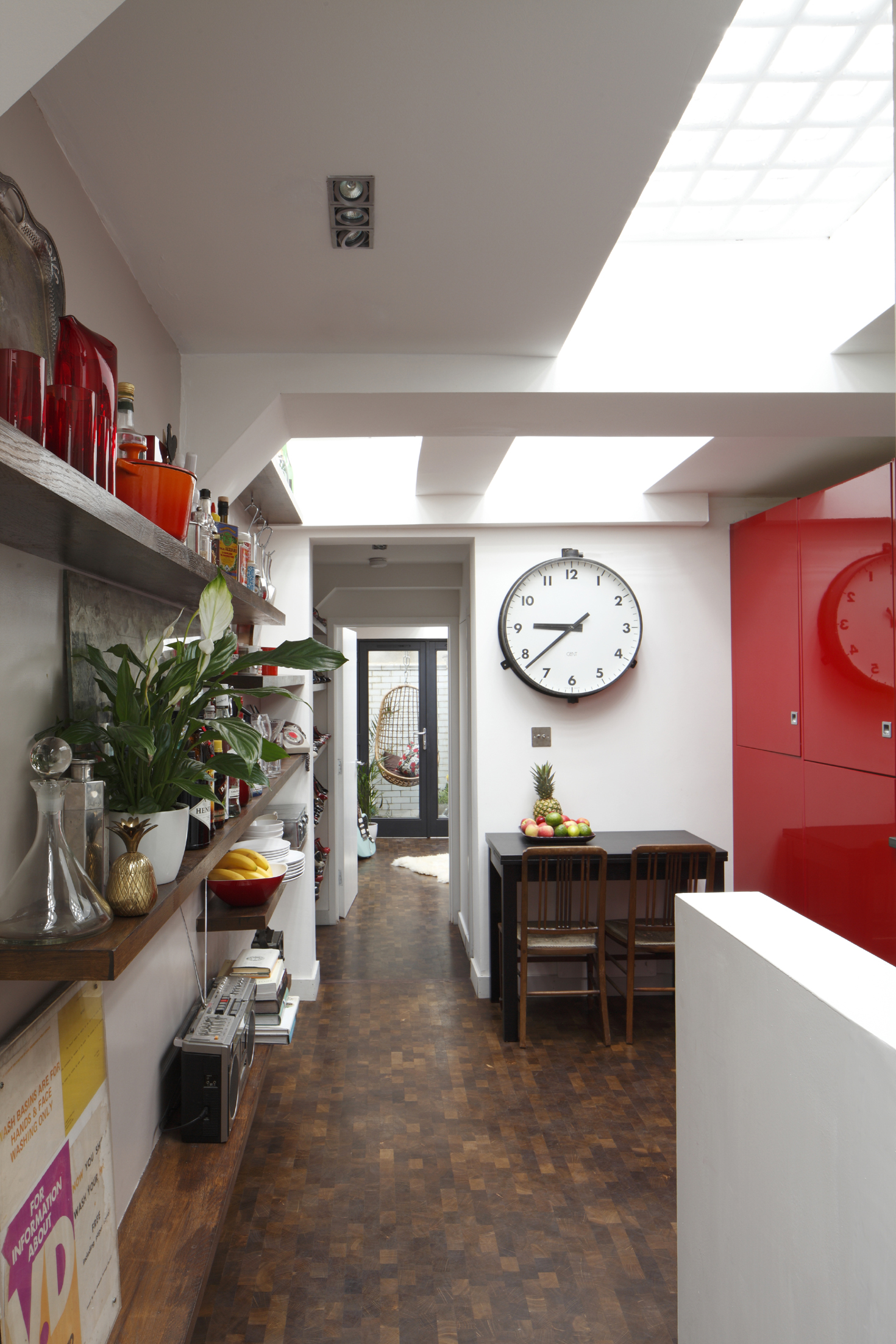 As the developer, I worked as the architect, client and contracted all trades. Careful value engineering and simple detailing were key to transforming this unlikely site into a contemporary home. All finishes were carefully chosen and details designed to ensure a unique bespoke feel. Floating shelves flow down the interior spine wall. These are a key design and display feature as well providing practical storage. The courtyard garden has been planted with evergreen shrubs and ferns
