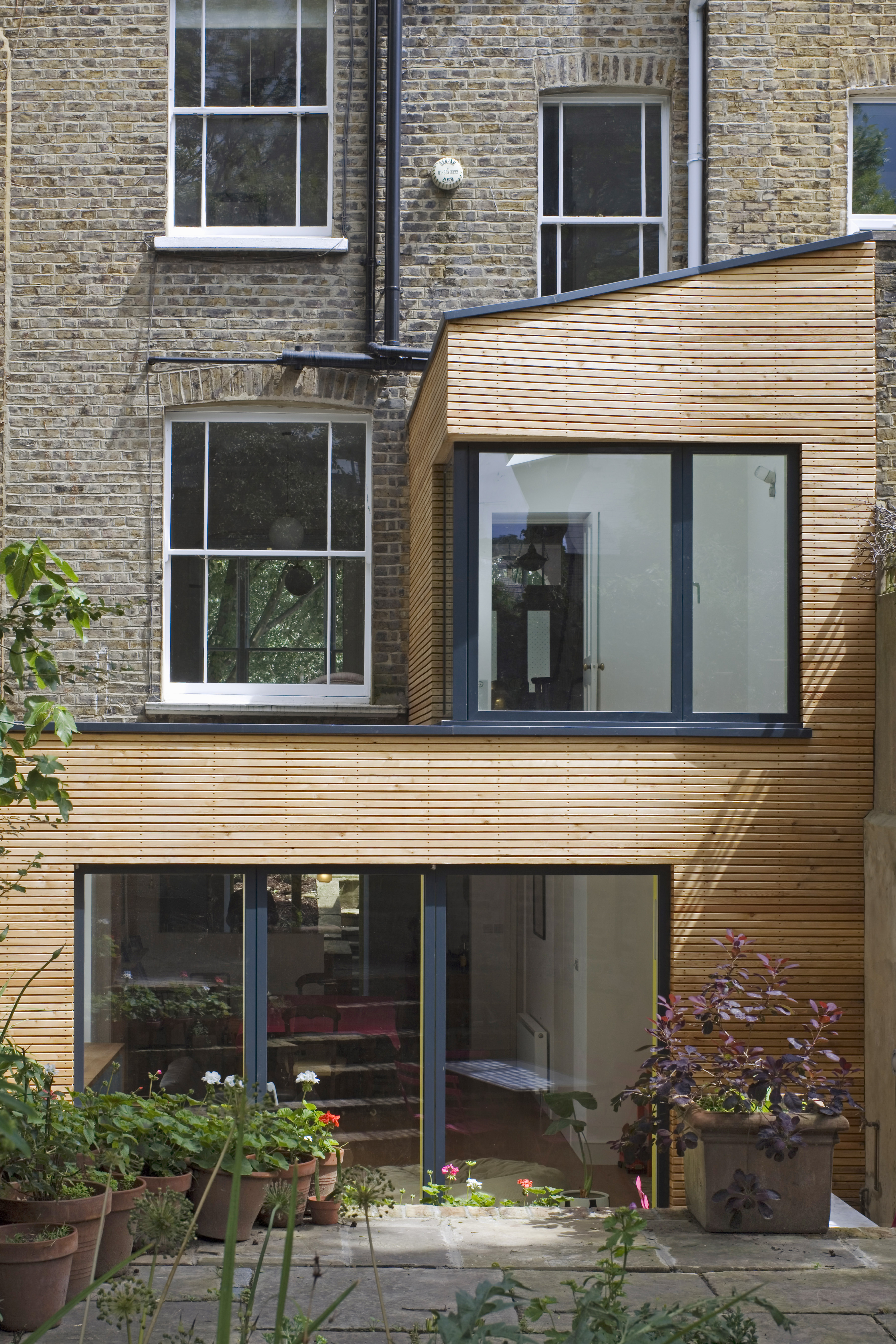 The overall form of the extension was carefully considered with a ‘cranked’ rear elevation which endeavours to capture the westerly afternoon sun. Clad in splayed larch, the boards follow the form of the ‘crank’ to create a dramatic sweep and are mitred at the corners to form the window reveals. Over time the cladding will naturally silver in colour and blend with the existing London stock brickwork.