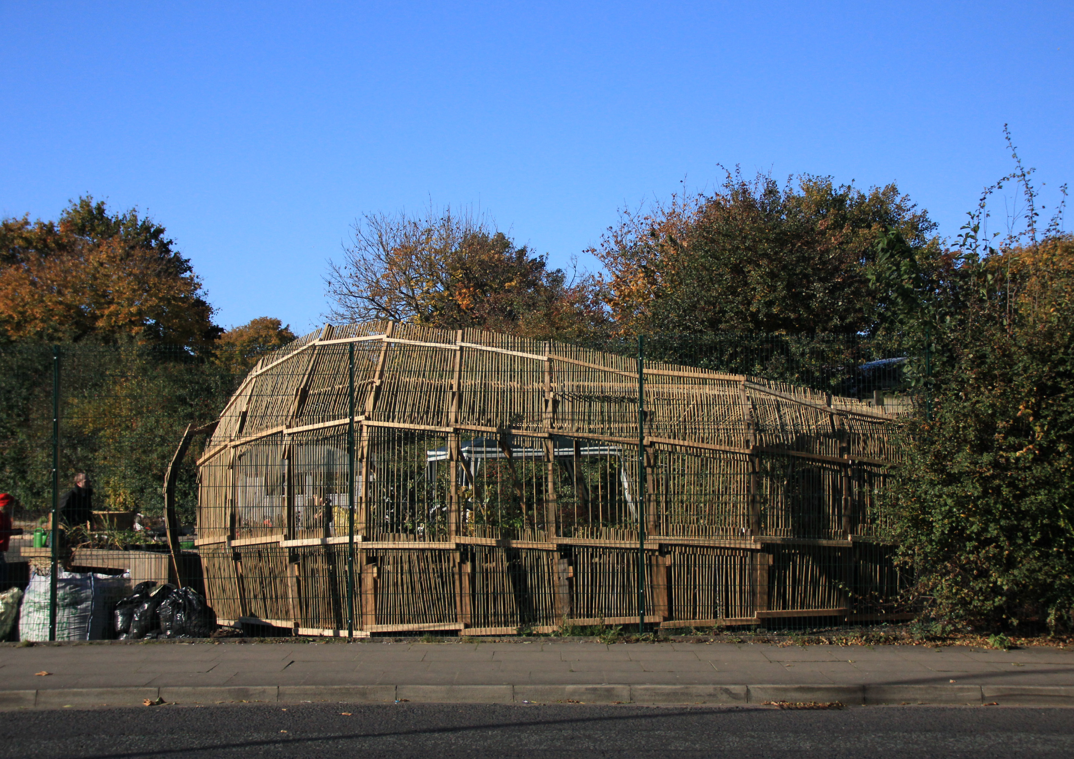 A shaded sales area to house plants for Hulme Community Garden Centre. Constructed entirely from waste and reclaimed materials