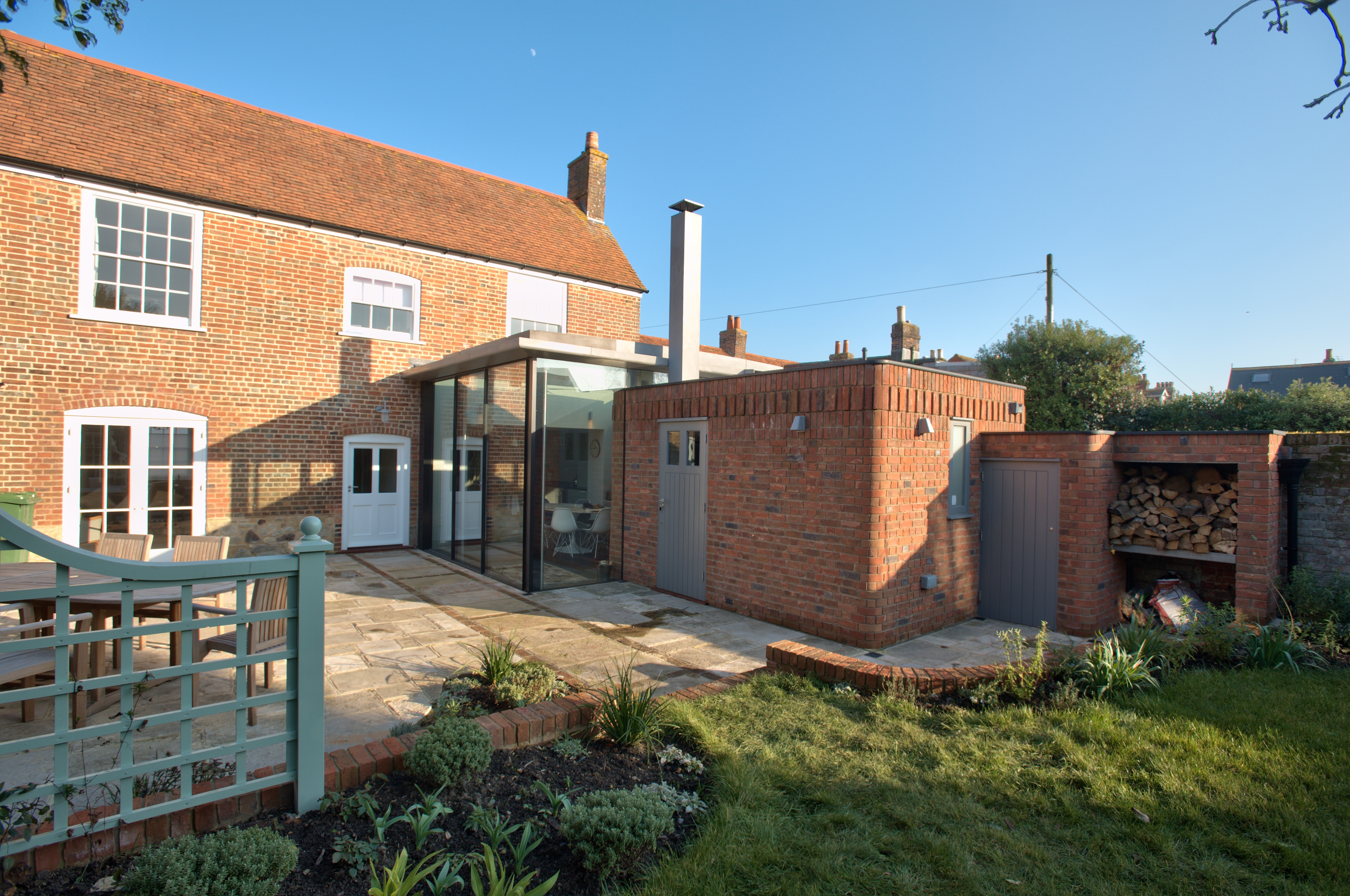 Residential grade II listed town house with new glass, brick and polished concrete extension in walled garden