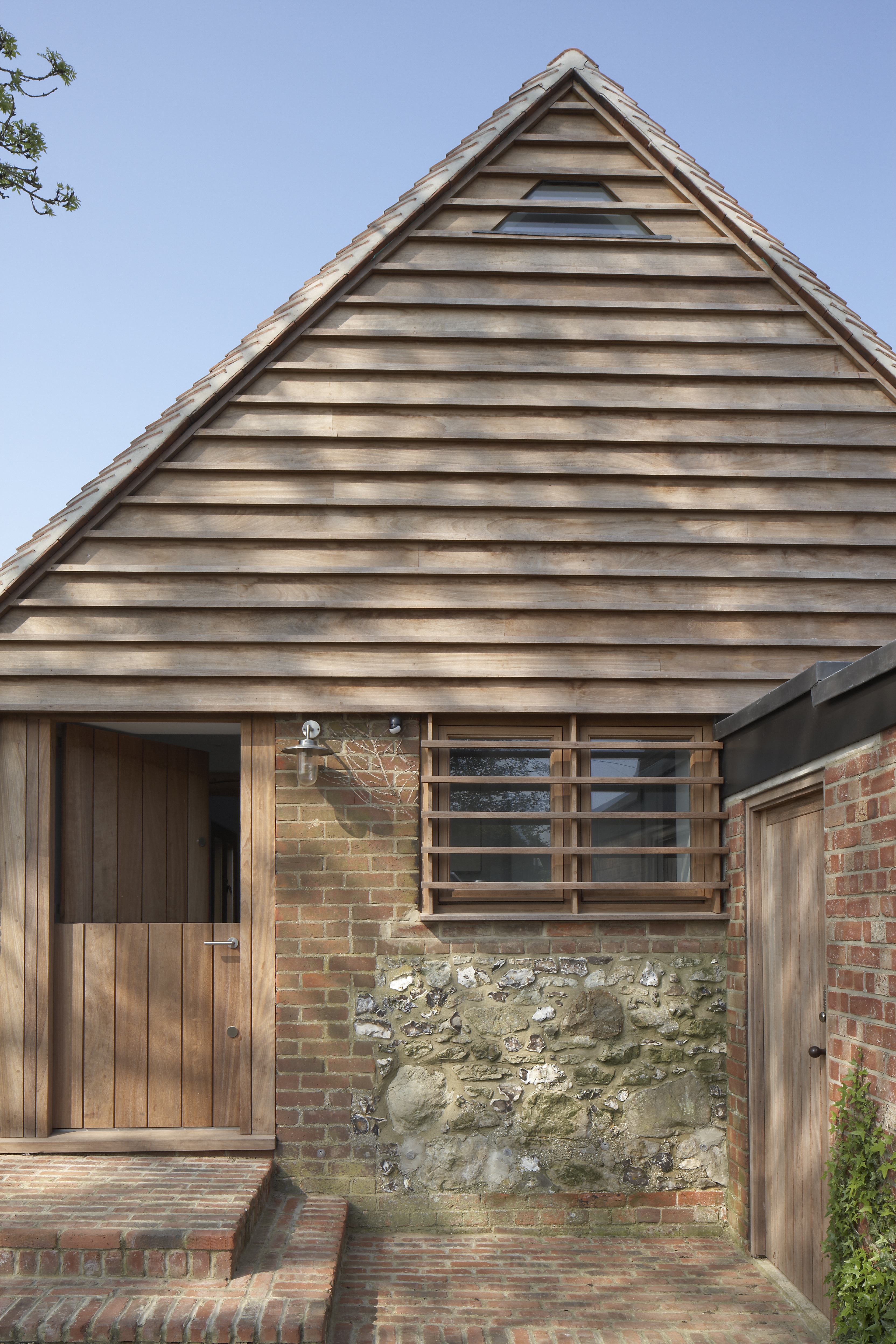As such, domestic features such as windows and doors are set behind bespoke hardwood timber fixtures designed to camouflage the external appearance. These have been left untreated to blend in with aged qualities of the adjacent flint and brickwork walls. Inside, the historic roof timbers have been kept in place and are coupled with a playful reinterpretation of the original brick floor.