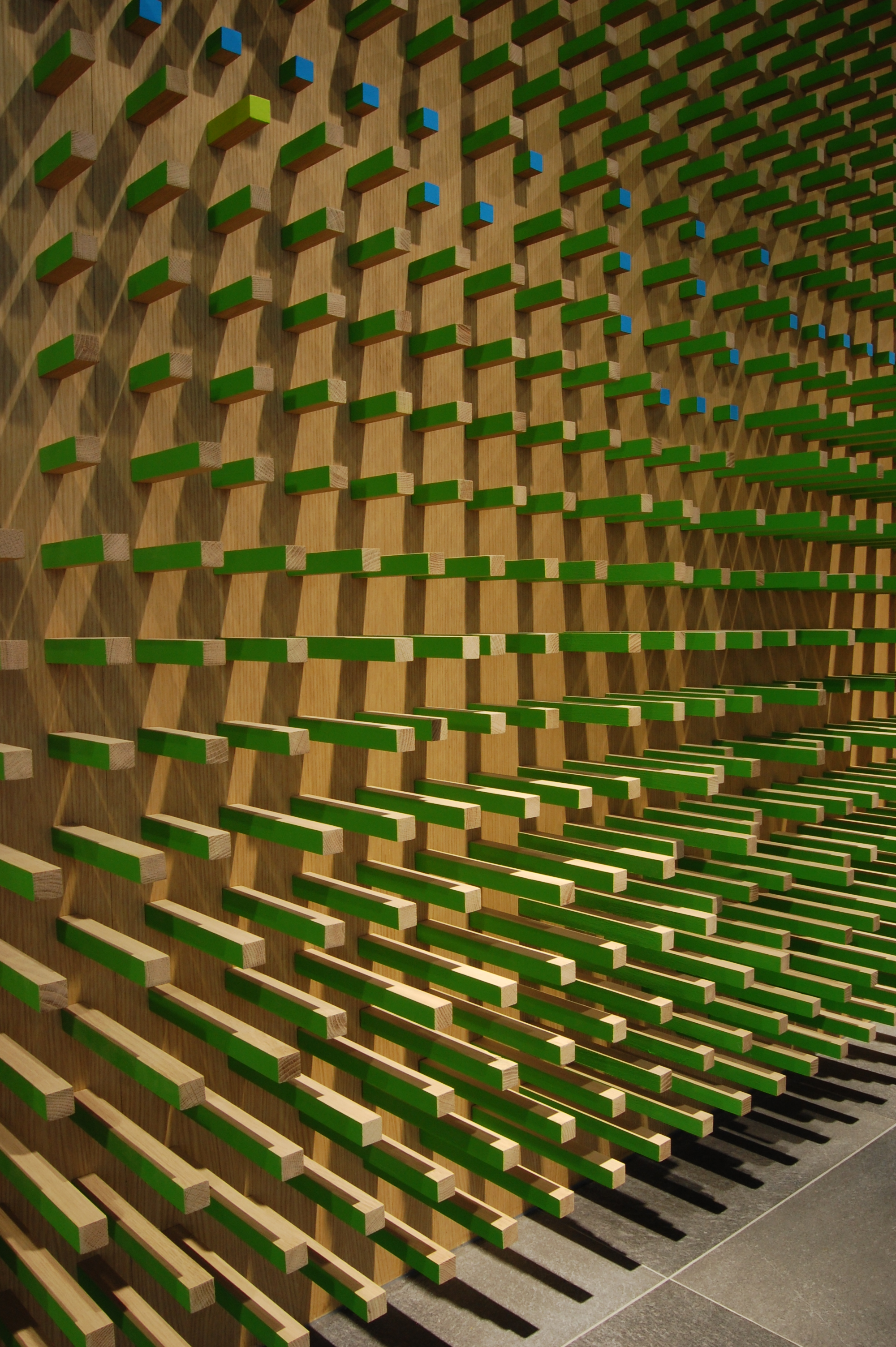 The scheme attempted to re-forge a lost link between the old wharf-side warehouse to the Thames and redefine it’s riverside location. The design created a topographical, three dimensional relief map made from1400 oak pegs of various lengths along the 5 metre wall. This reflected the contours of the river basin, with the path of the River Thames depicted in blue pegs.