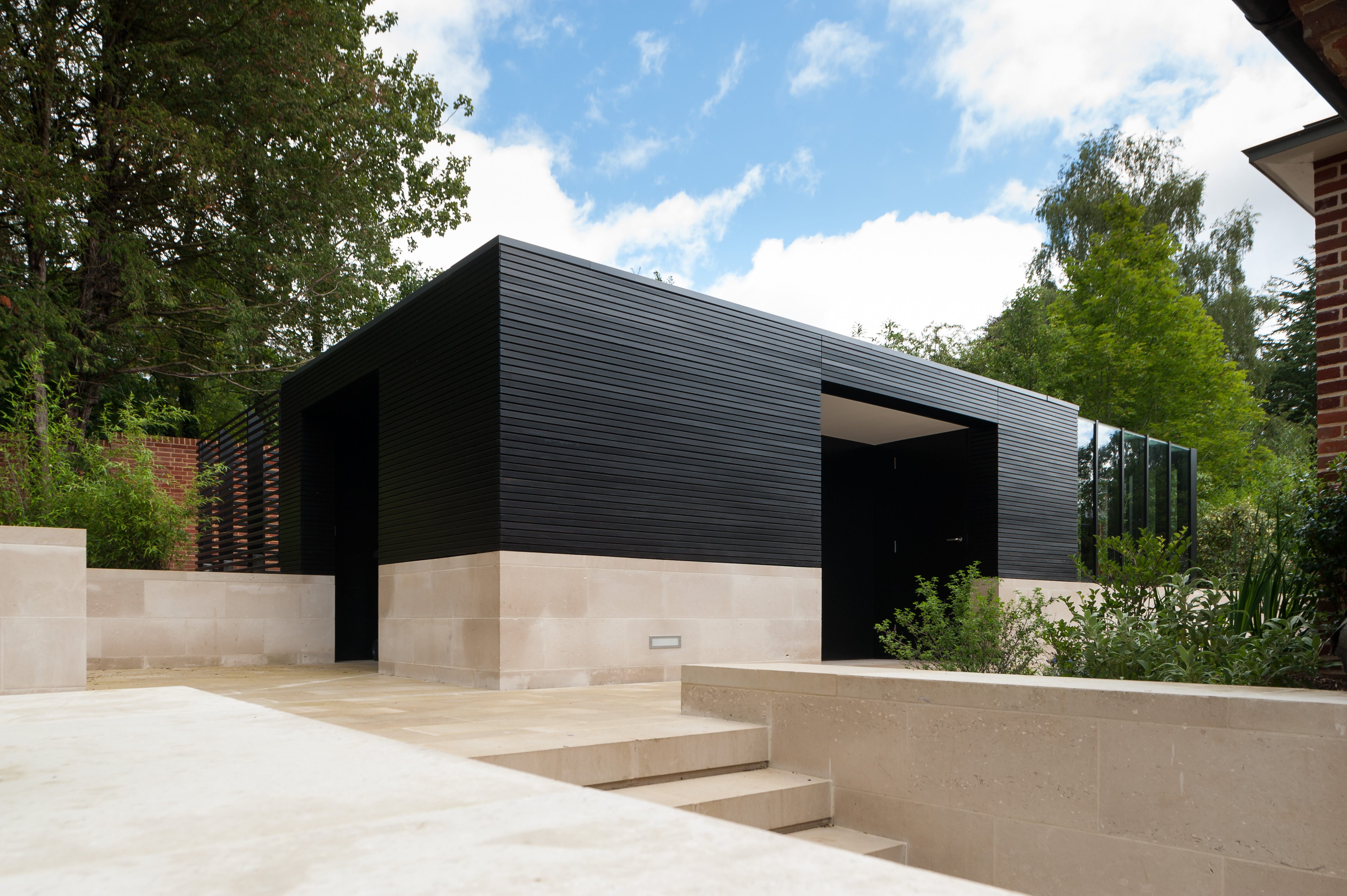 The Accoya timber cladding has been stained, providing a dramatic counterpoint to the stone and glass louvres which are controlled through a building management system to regulate internal temperature. The narrow banding of the timber accentuates the horizontal planes of the stone below, contrasting the vertical panels of the glass greenhouse structure.