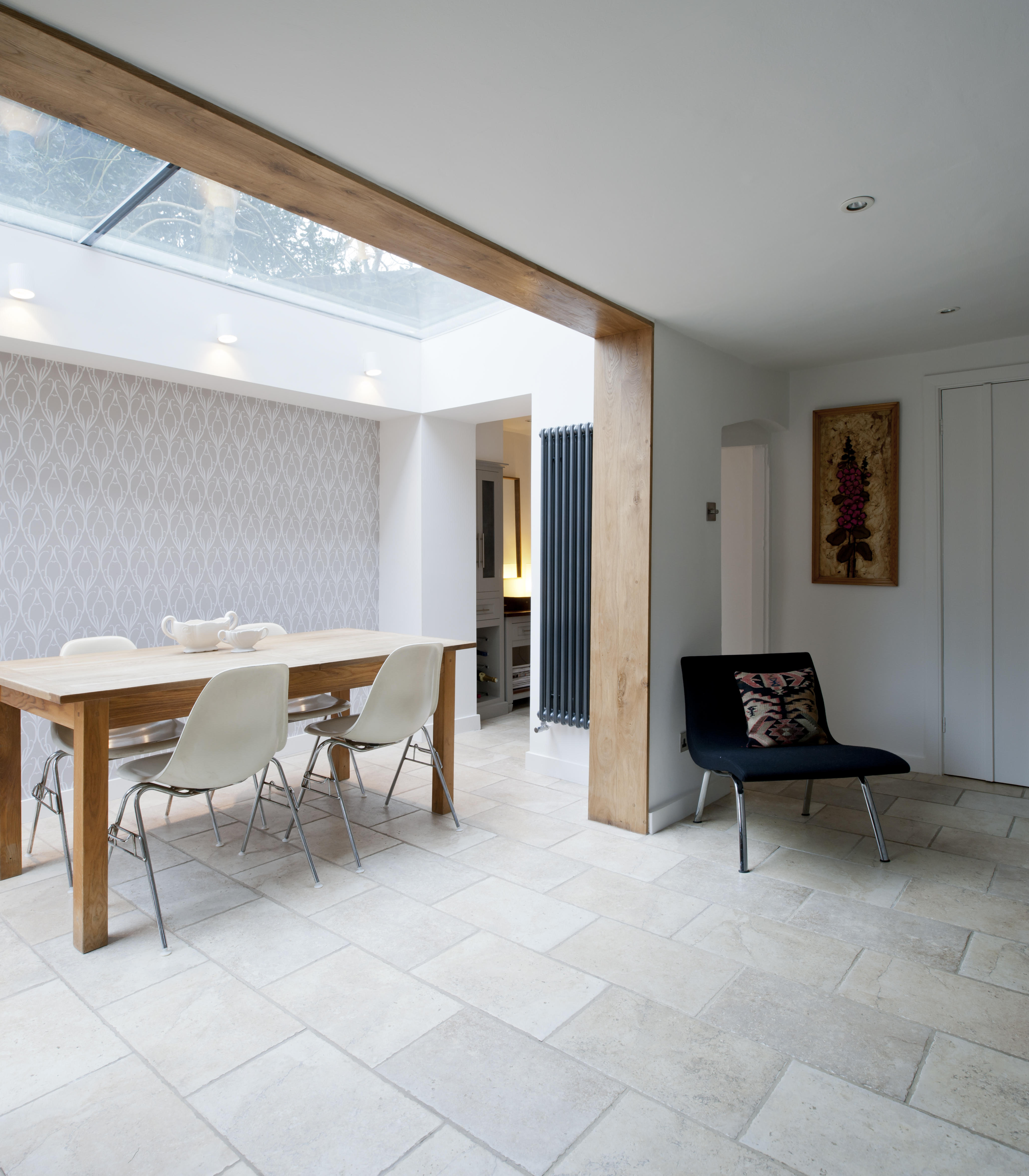 The glazed extension is a simple structure, spanning an existing exterior wall to the rear and a garden wall running parallel to the house. A lean-to roof was removed to allow a clean, simple juncture between the historic fabric and the new roof, exposing the brickwork and opening up the kitchen and dining areas.