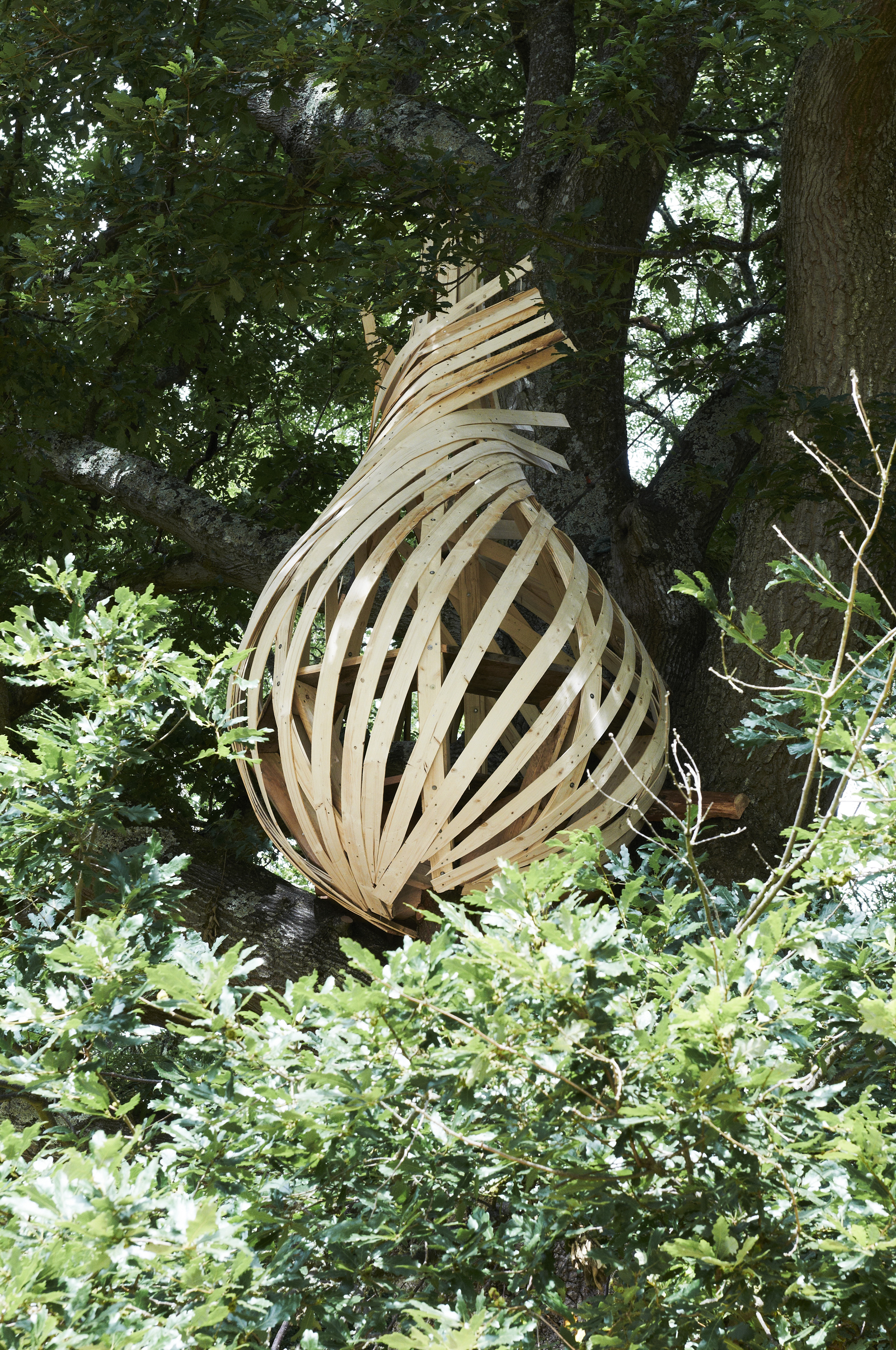 The brief for the new treehouse came from the owners of the farm who wanted a safe play-space for their grandchildren. All the materials were milled on site from locally felled spruce, larch and western red cedar. There are no fixings to the tree, with the structural stability maintained by the shape and positioning of the structure. The form of the treehouse is inspired by a Weaver Bird’s nest to provide a dramatic but safe space to dwell and play in the treetops.