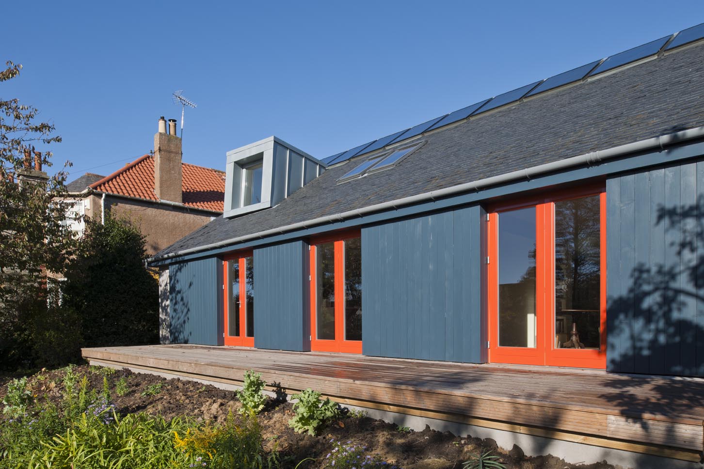 Thus the new timber cladding references fishermen’s storage huts at the harbour, the orange windows are similar to those of a house the client liked on another street nearby and recall the pre-twentieth century preference for coloured windows (before white paint was readily available). The new dormer window is skewed to focus on Gregory’s Pillar on a distant hill.