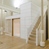 A simple, contemporary and light-weight palette of white faced ply panelling, oak veneered birch ply as ribboning emphasis to all openings, the insertions slot subtly into their historic setting.