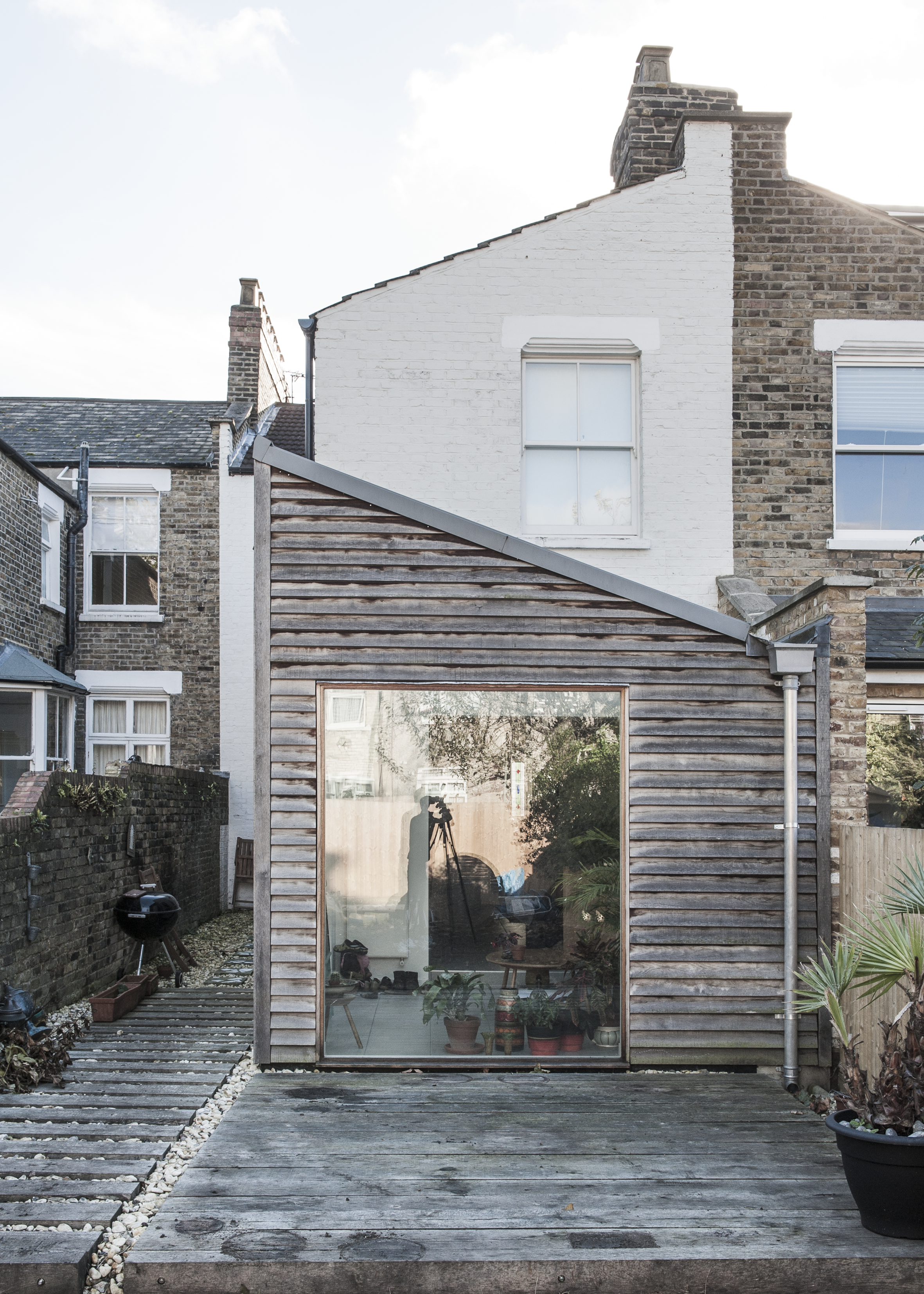 The client wanted a light, calm room in the rear garden of her terraced house that was economic to build. The extension is congruous with it’s urban surroundings and suggestive of a rural idyll; the roof mirrors the pitch of the terraced roofline above whilst the untreated timber shiplap cladding wistfully recalls a country hut. Some rural details provided very practical solutions, such as the stable door which keeps children in whilst opening the room up to the elements. A refined use of timber internally is balanced by robust, weathered timber on the outside to withstand the elements.