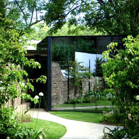 The pavilion has been inserted between two irregular existing walls, with timber shiplap cladding providing a rain screen above the height of the wall while exposing the brick to the interior space. In order to integrate the pavilion with its surroundings, black painted timber, a sedum roof and reflective glazing wrap the slender frame.