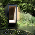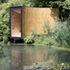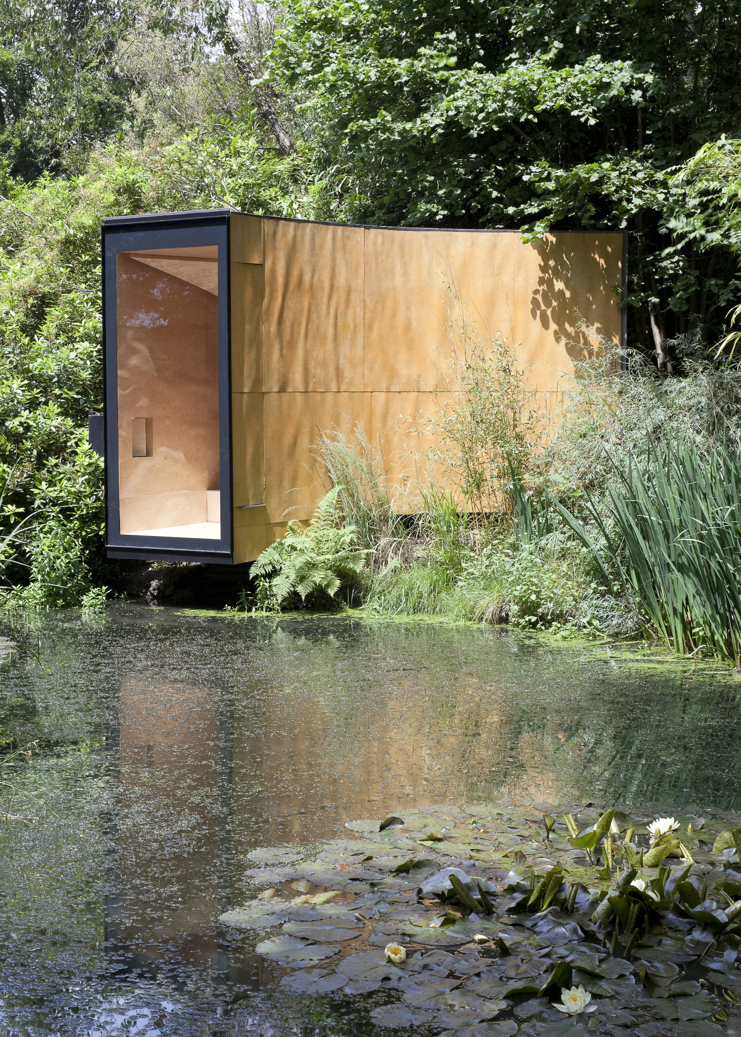 Cantilevering over the bank of a pond at the foot of a family garden, the timber frame structure is finished in plywood, glass and copper and was designed and built by TDO Architecture for a budget of £7,500.